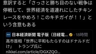 嫌儲 高市サナ「世界に平和をもたらるのはトランプさんだけ♥」有識者「さすが高市さん!京言葉使った実に上手い言い方!!」