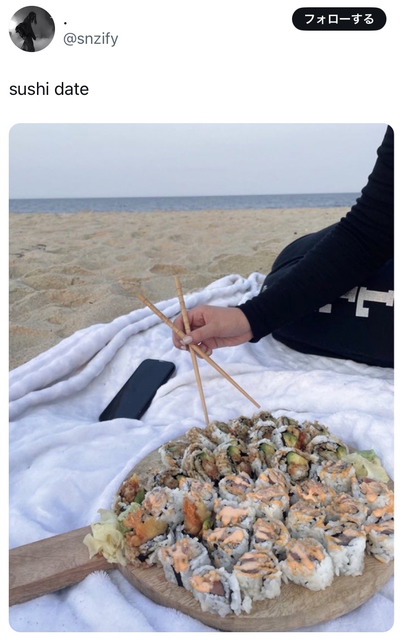 あと日本人が寿司系を浜辺に持ってきて食べるってあんま無いから斬新に見える