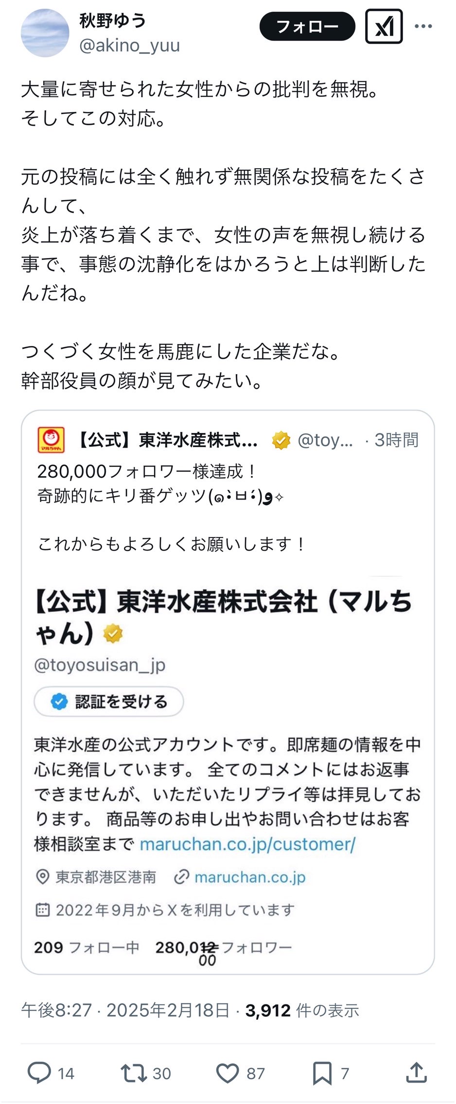赤いきつねアニメCMで炎上中のマルちゃん、フォロワーが増えて喜ぶ→フェミさんブチギレ「女性の声を無視するな!!」