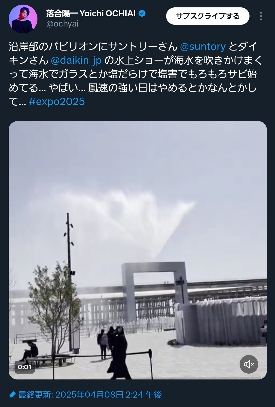 大阪万博のメインイベント「噴水ショー」で海水が使われているため、落合陽一の鏡パビリオンが既にサビ始めている模様www
