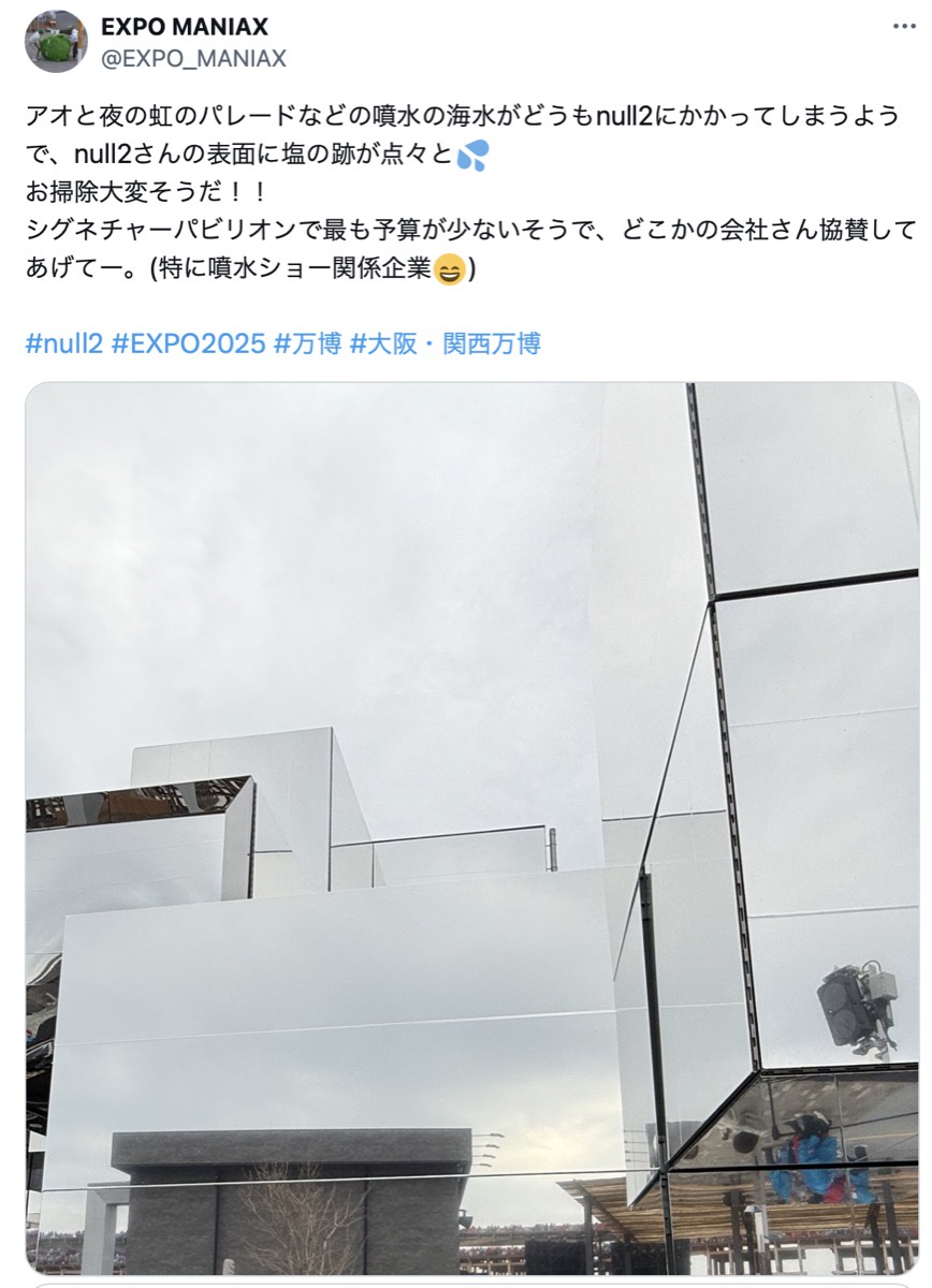 大阪万博のメインイベント「噴水ショー」で海水が使われているため、落合陽一の鏡パビリオンが既にサビ始めている模様www