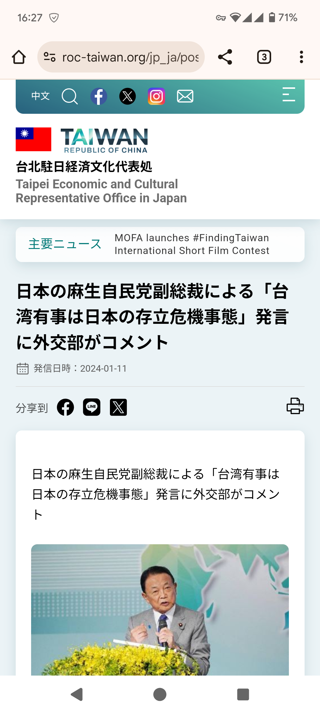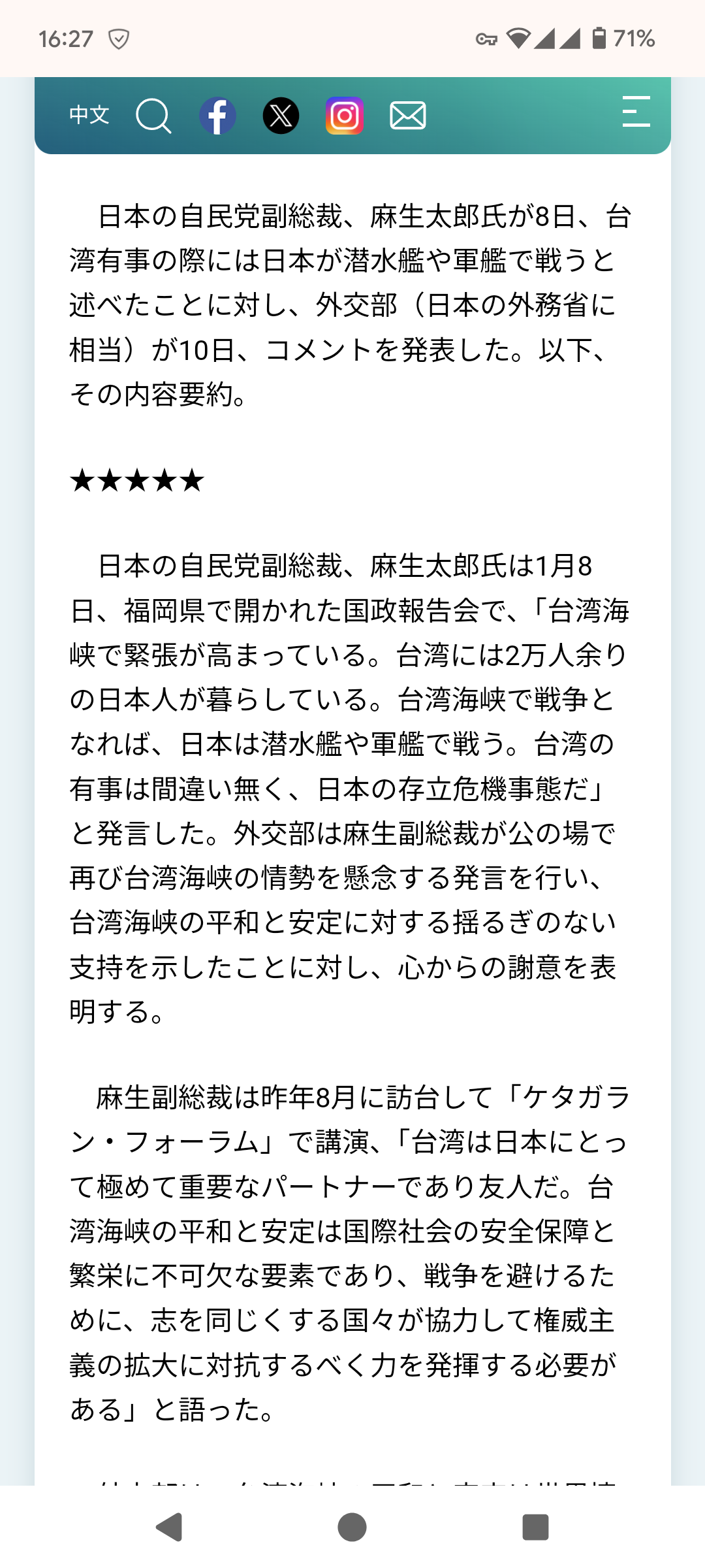 日本の自民党副総裁、麻生太郎氏は1月8日、福岡県で開かれた国政報告会で、「台湾海峡で緊張が高まっている。台湾には2万人余りの日本人が暮らしている。台湾海峡で戦争となれば、日本は潜水艦や軍艦で戦う。台湾の有事は間違い無く、日本の存立危機事態だ」と発言した。