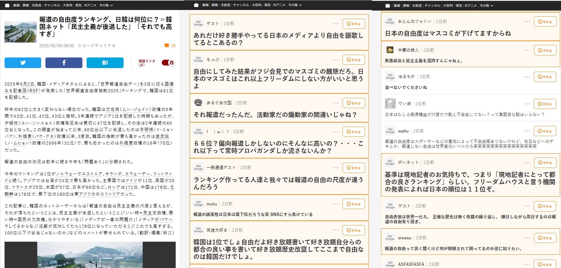 「報道の自由度ランキング2025」・・・台湾24位、韓国61位、日本66位、中国178位、北朝鮮179位🤢
