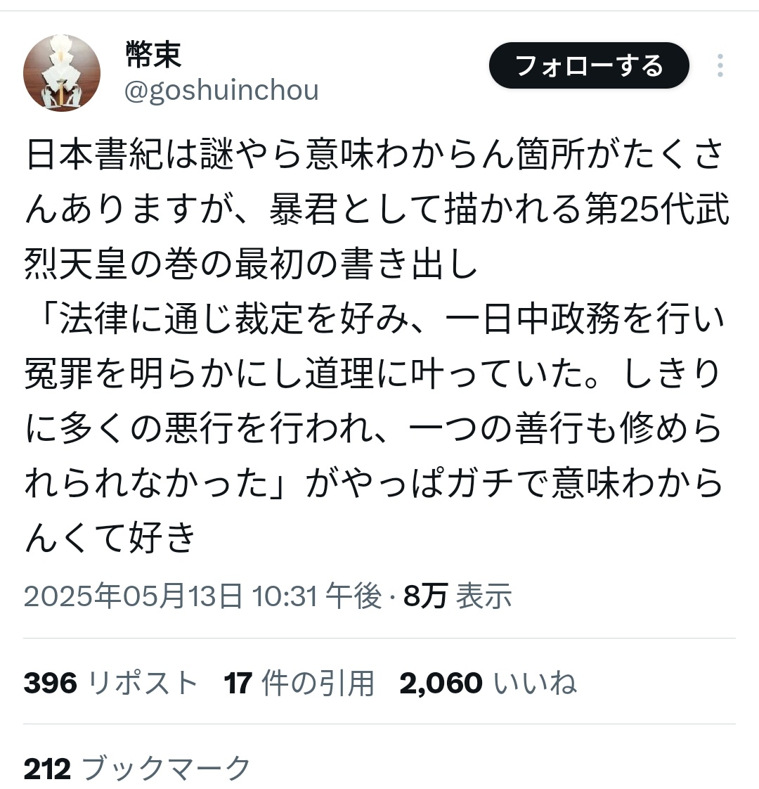 日本書紀「武烈天皇は真面目で1日中政務を行い冤罪を明らかにしていた。彼は多くの悪行を行い、一つの善行も修めなかった」