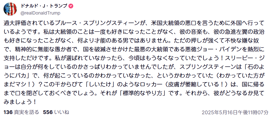 トランプ「皮膚が萎縮し干乾びたシイタケのようなロッカー、ブルーススプリングスティーンは私の悪口を言うために外国へ行った