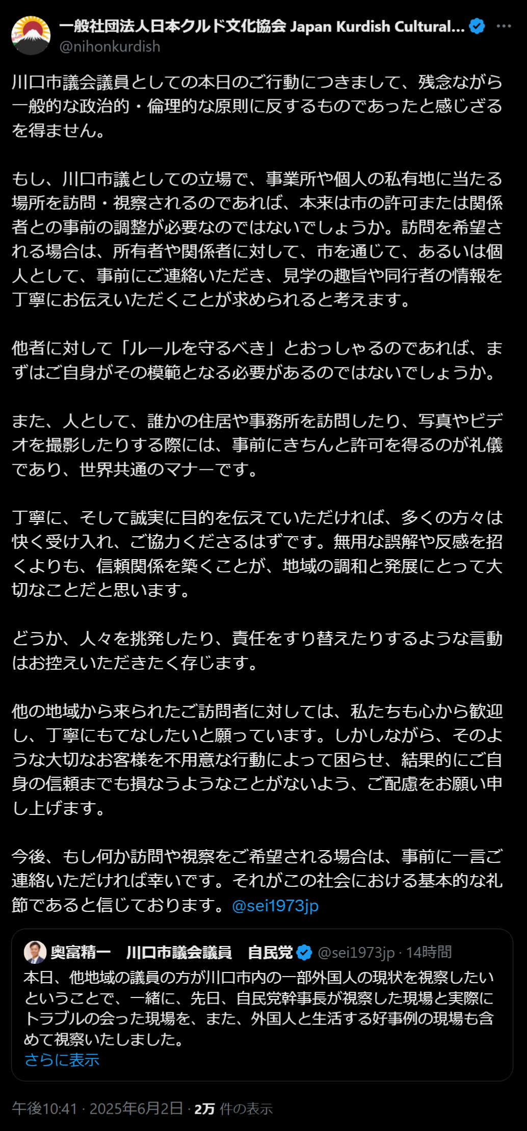 これおもしろいのは議員のほうは「クルド」という文字は一切出してないのに、クルド協会が長文でお気持ち表明を始めたことだよね