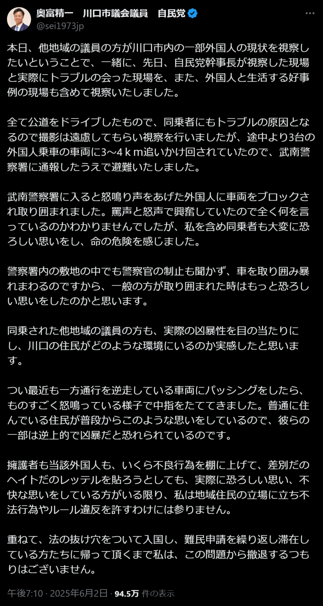 自民議員「川口を視察するか」→怒鳴り散らす外国人の車数台にブロックされ警察沙汰→クルド協会が反論