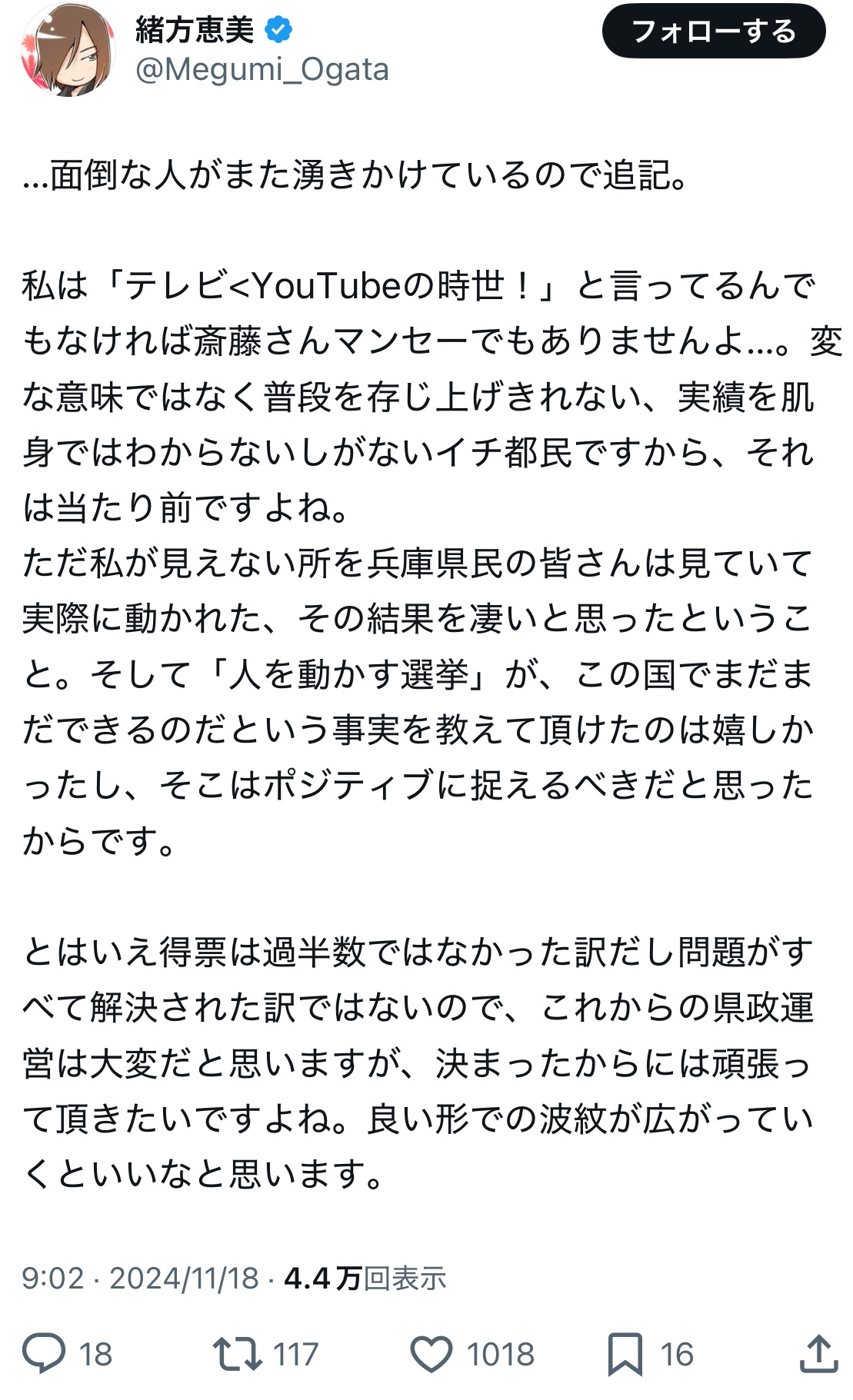 緒方恵美さん、斎藤元彦信者だった「この勝利はまごう事なき斎藤さんのもの。誠実な仕事は伝わり動かすのだ。この国はまだ明るい」