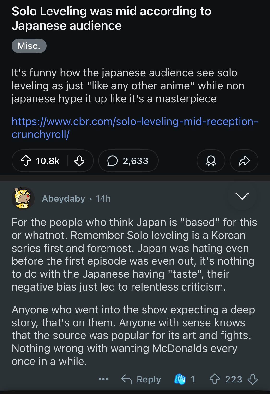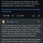 ↓「日本が“正しい”とか“さすが”みたいなことを言ってる人たちへ。忘れないでほしいのは、『俺だけレベルアップな件(Solo Leveling)』は何よりまず韓国の作品だってこと。日本では第1話が放送される前からすでに批判的な声が多かったんだ。それは“日本人のセンスがいい”とかじゃなくて、単に最初からネガティブなバイアスがかかってたからに過ぎない。