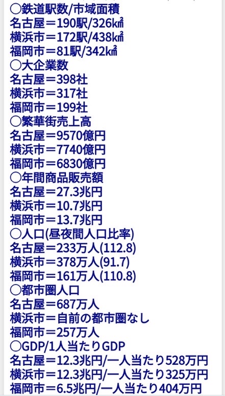 名古屋だなやっぱりていうか横浜が福岡に負けてる項目多すぎて草