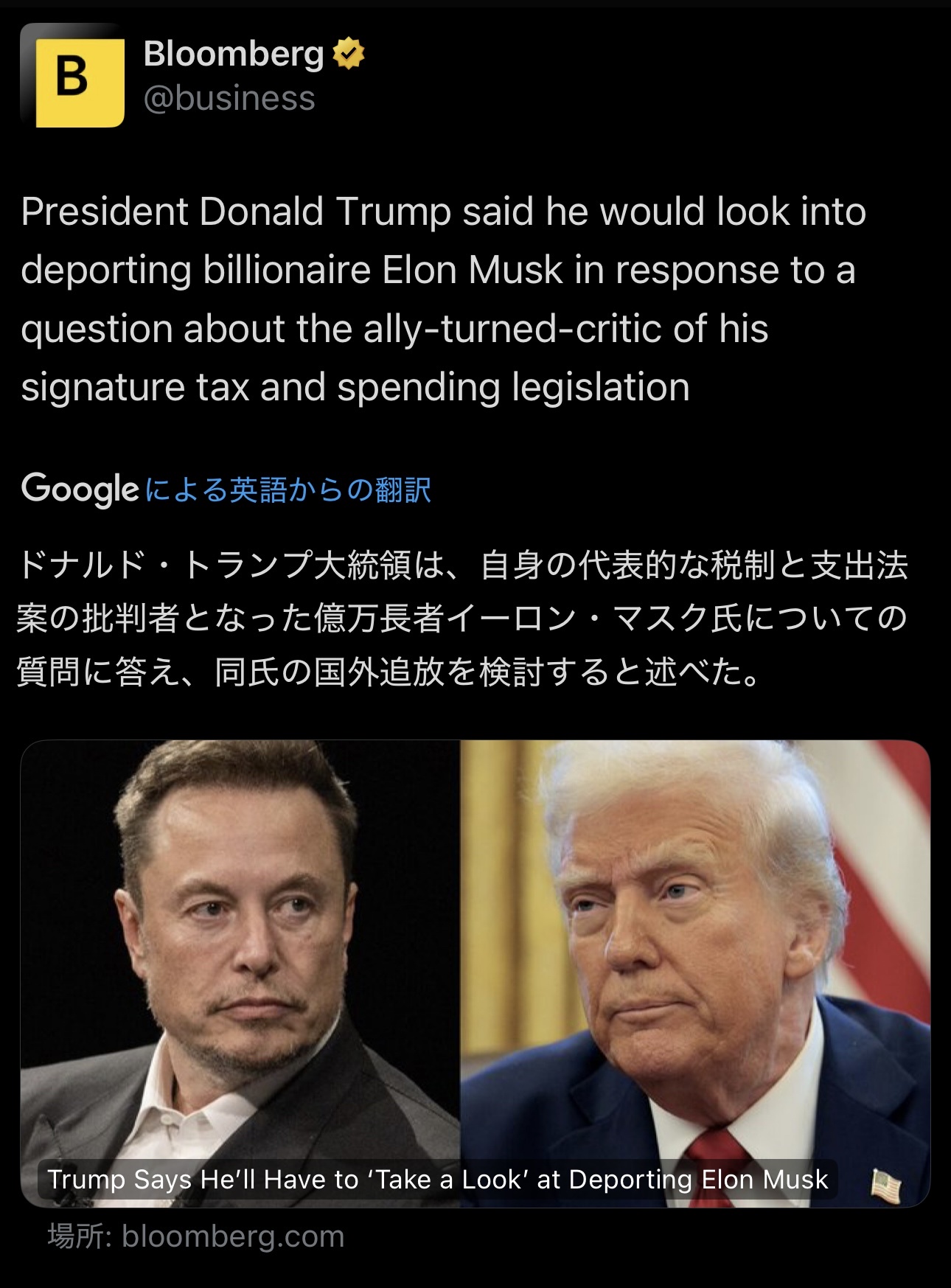 その後またイーロンマスクがトランプの政策批判して🐯がおこ - 29 : 2025/07/01(火) 22:15:07.20 ID:Gpj3uoIe0