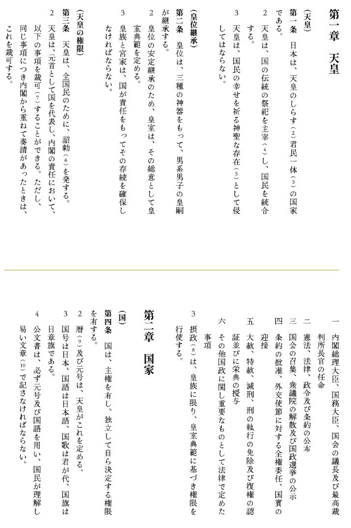 (前文に「八百万の神を祀り」とあり、「天皇は国民に詔勅を発する」とある。なお信教の自由の記載は無し)