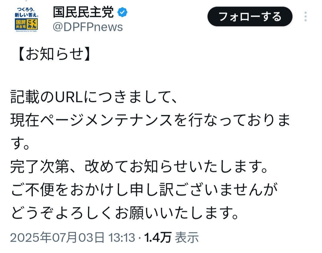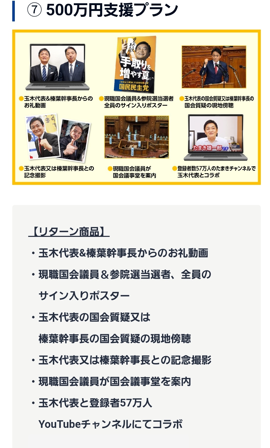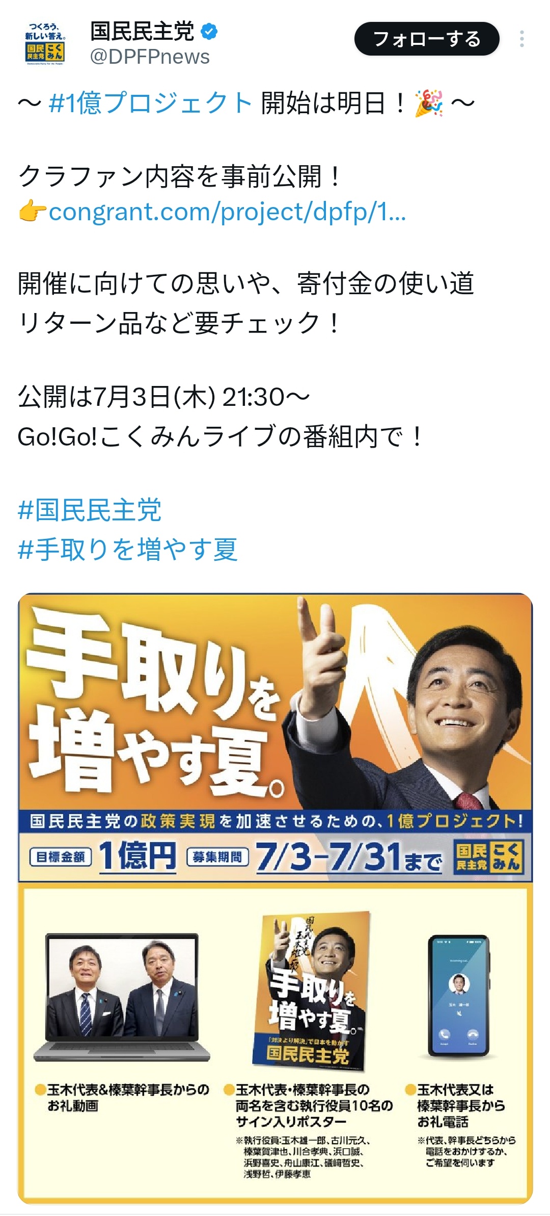 https://news.yahoo.co.jp/articles/a0fe6a0c827f83f88b910615fe6b0b57cf45957e手取りを増やす夏にする!国民民主党の政策実現を加速させるための、1億円プロジェクト!(魚拓)
