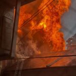 店舗8軒、計約500平方メートルが延焼中で、消防車が約50台が出動して消火活動にあたっているという。