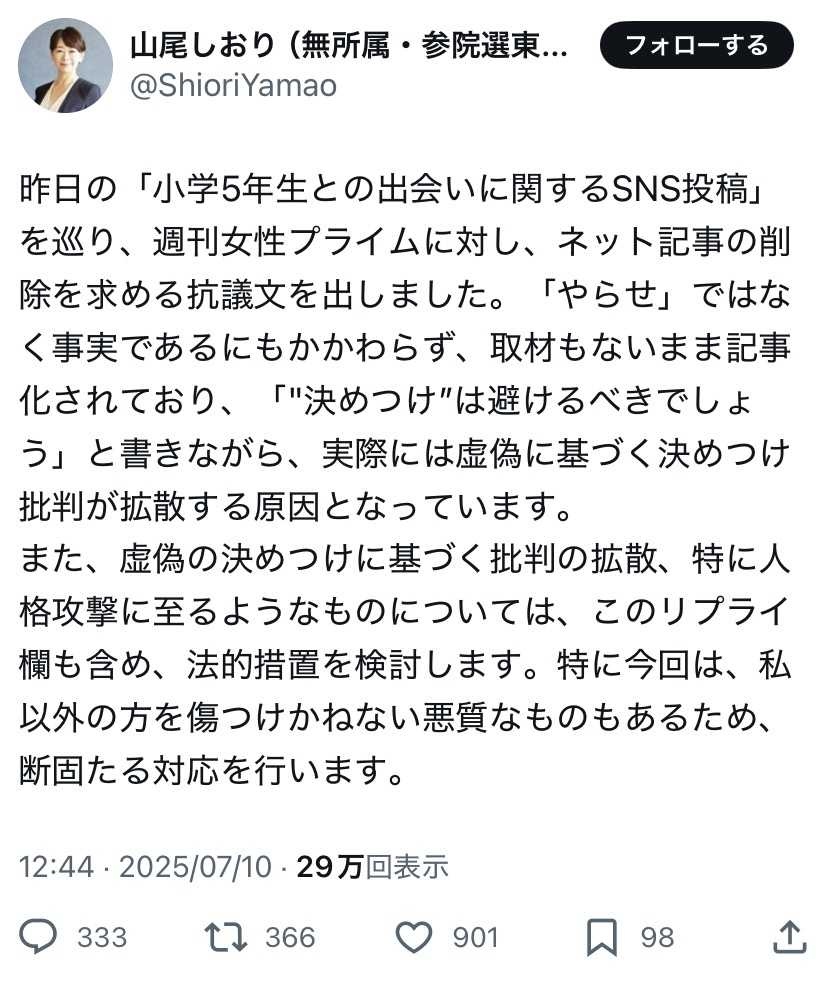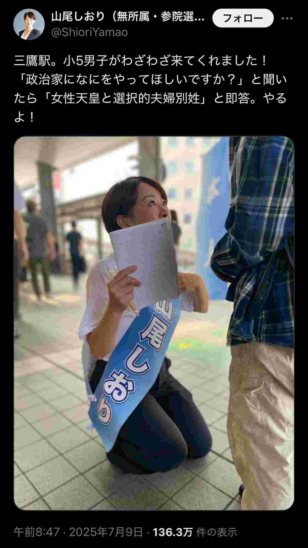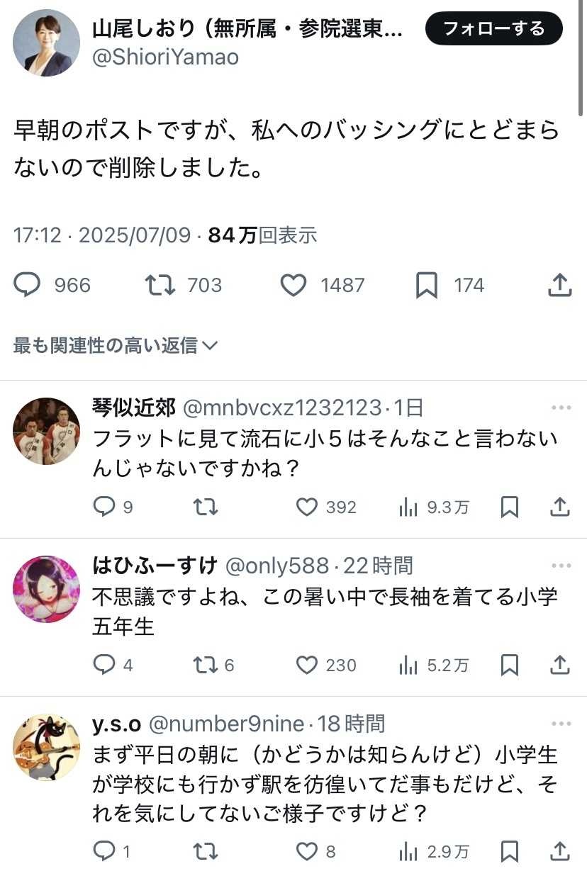 無所属・山尾志桜里氏、小5男子が「女性天皇と選択的夫婦別姓」投稿に猛ツッコミ「邪推に抗議」と反論も…一転削除