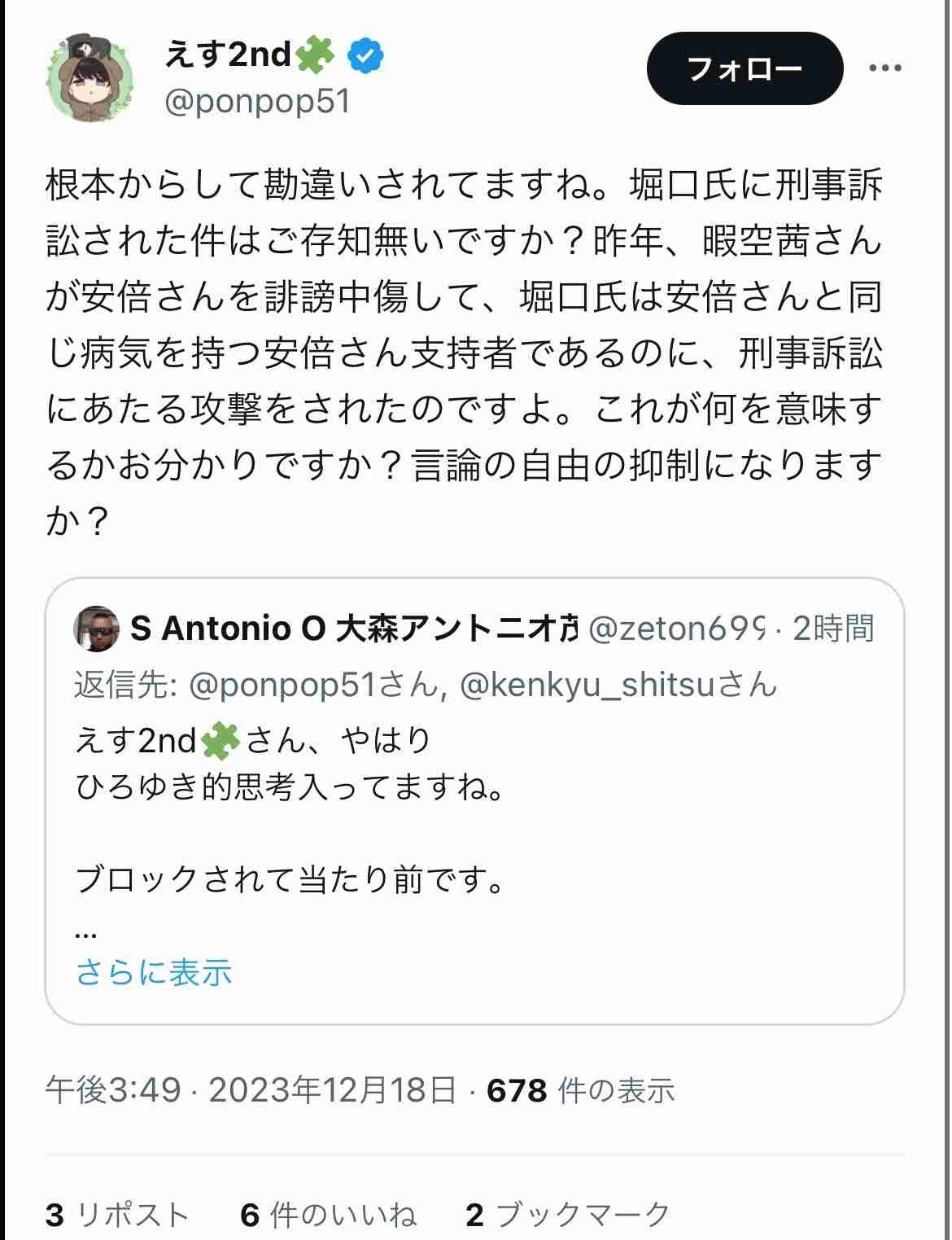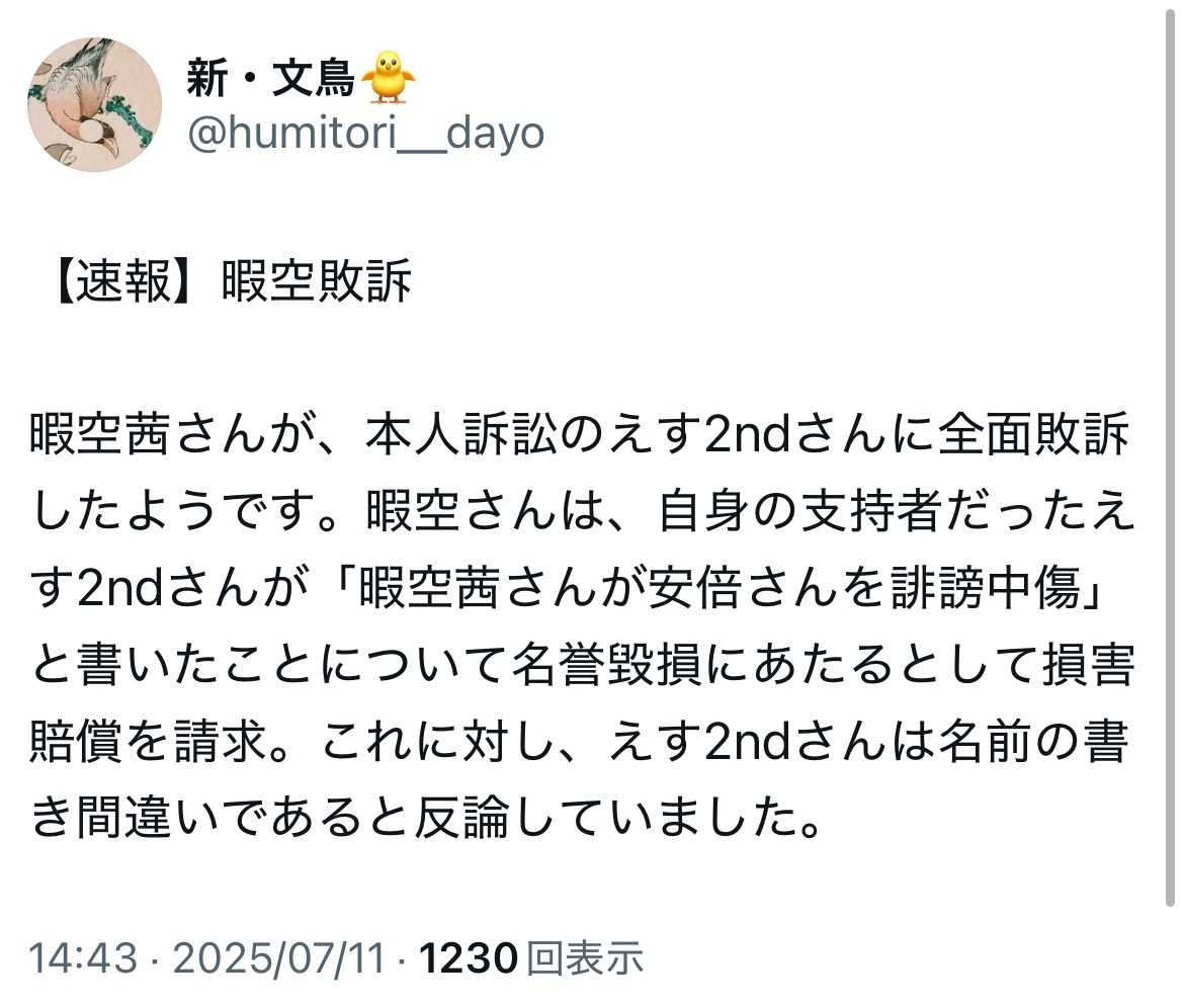 名前の書き間違いしたらしく「暇空が安倍晋三を中傷」と事実にないことを書く訴えないでと懇願する