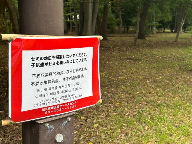 公園の利用者からは毎年のように「食用目的で乱獲しているのでは?」「地域の治安悪化につながる」などといった苦情が寄せられ、担当者は「7月中旬以降はアブラゼミの羽化が最盛期を迎える。利用者の意見を参考に今年は例年より早めに掲示した」と話す。