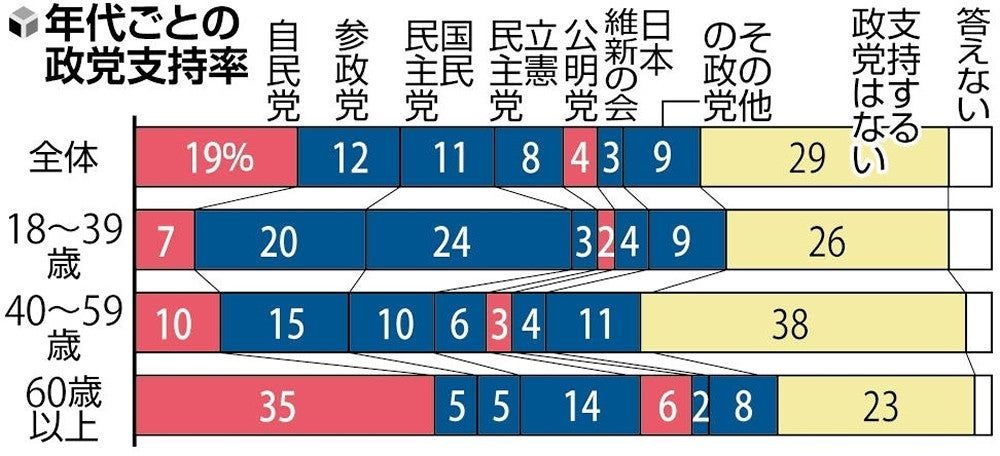 一方、自民党は、18~39歳が7%(6月調査10%)、40~59歳が10%(同19%)、60歳以上が35%(同35%)で、若年層の支持離れが顕著だった。