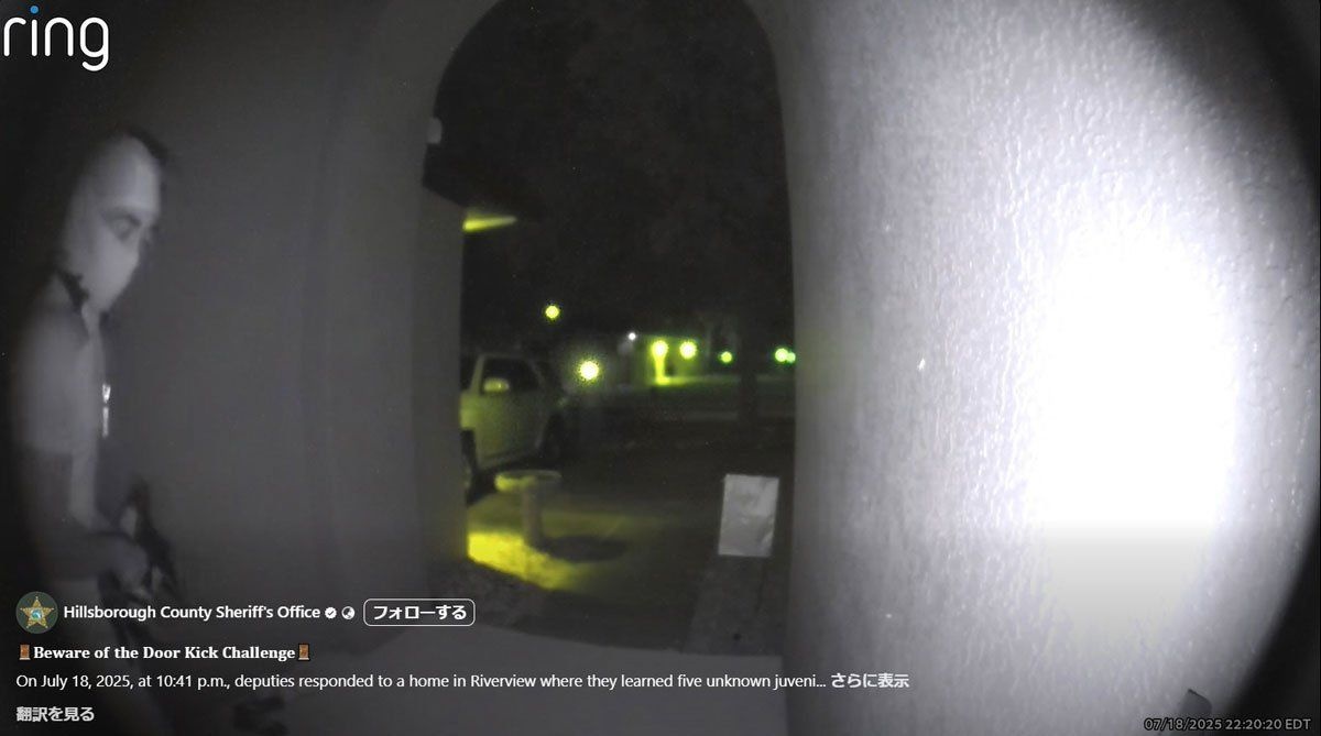 フロリダ州リバービューの家のドアベルカメラが捉えた動画には、18日午後10時30分過ぎ、マスクをかぶった5人のティーンエージャーが忍び足で歩き回り、そのうちの1人がドアを蹴り、偽の銃を発射する様子が映っている。