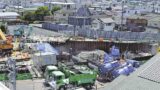 重機が入り、復旧工事が進められる陥没現場。周辺には振動・騒音や臭気を検知するモニターも設置されている(22日、埼玉県八潮市で)
