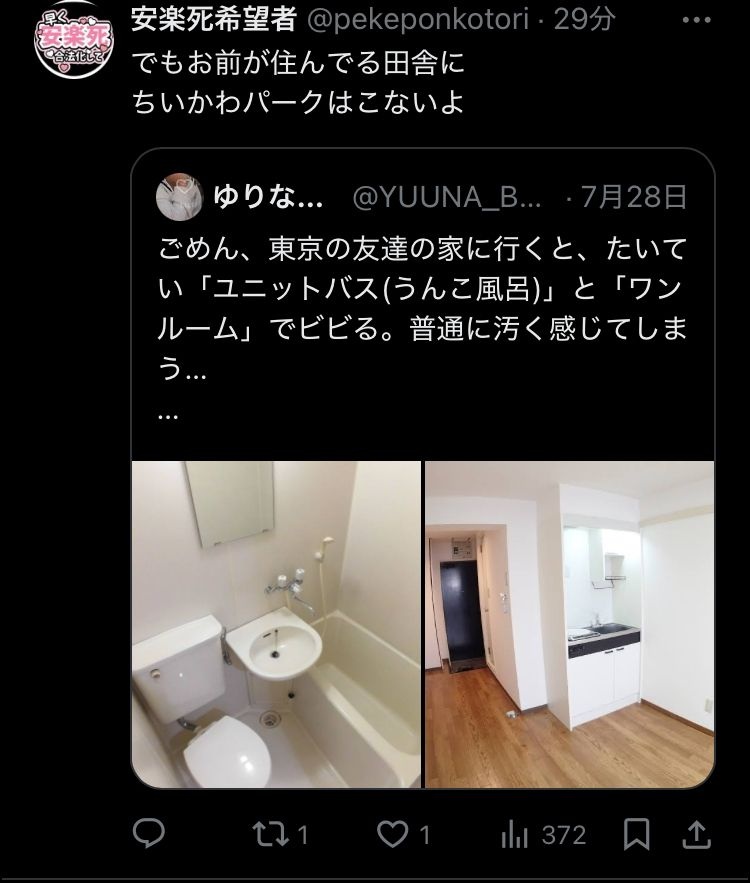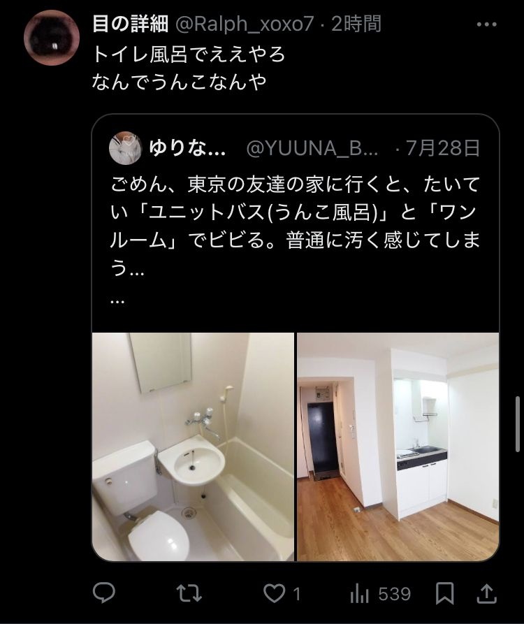 東京脱出ゆりな🍼牛乳パック (@YUUNA_BURUBESUM) on Xごめん、東京の友達の家に行くと、たいてい「ユニットバス(うんこ風呂)」と「ワンルーム」でビビる。普通に汚く感じてしまう… こんな独房みたいな部屋で「掃除が楽」といって酸っぱい葡萄してるの見てすごく哀れになったx.comごめん、東京の友達の家に行くと、たいてい「ユニットバス(うんこ風呂)」と「ワンルーム」でビビる。普通に汚く感じてしまう…
