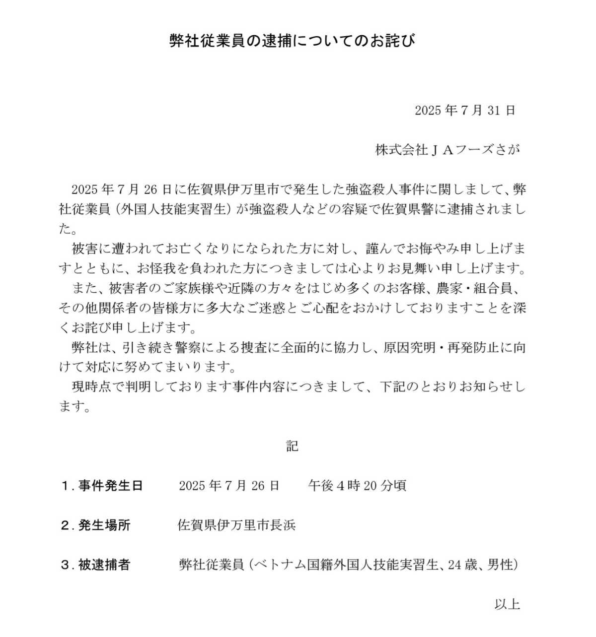 JAフーズさが、ベトナム人実習生の逮捕で謝罪文