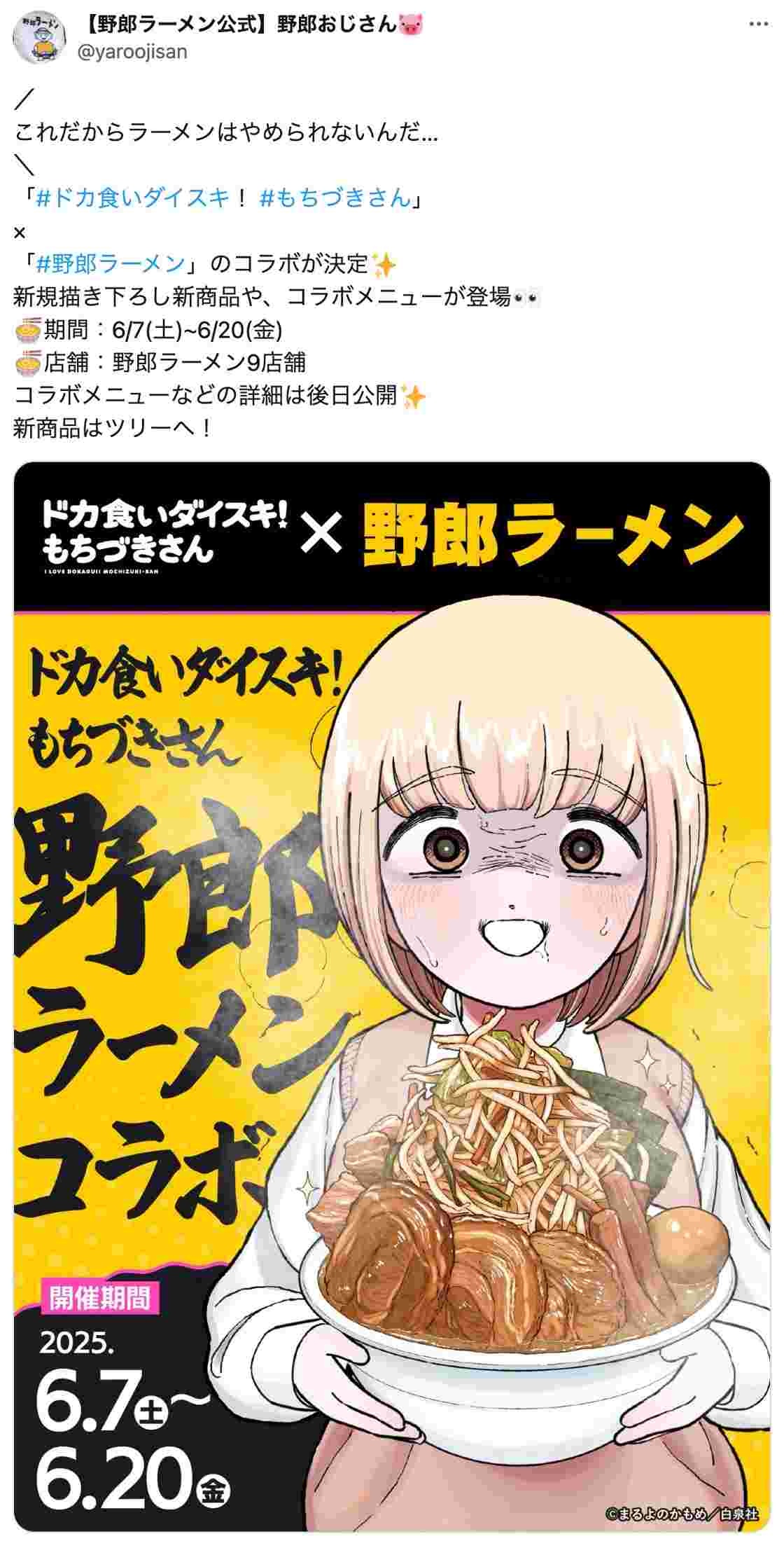 『もちづきさん』がついに「野郎ラーメン」とコラボ もちづきさんがドデカなラーメンどんぶりを抱える描き下ろしイラスト公開(リアルサウンド) – Yahoo!ニュース