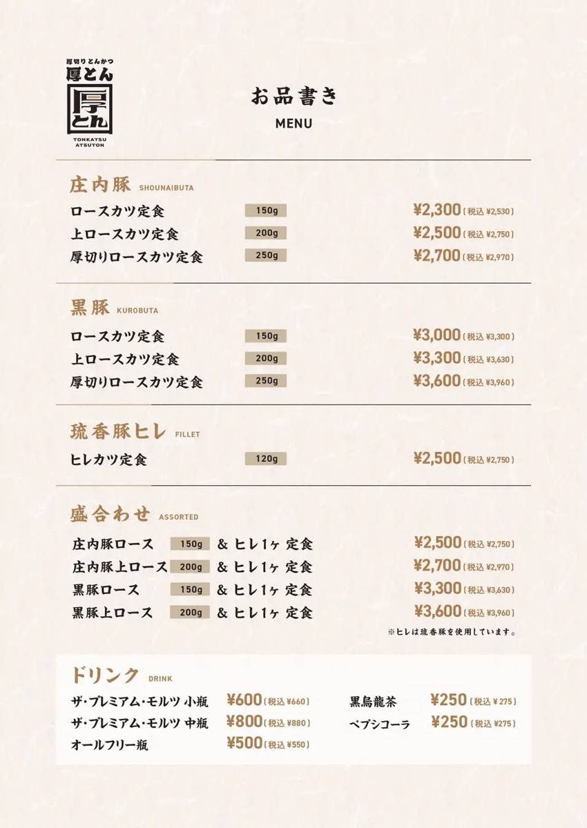 とんかつの衣や油にもこだわり、豚肉の旨味を最大限に引き立て、食べた後も厚切りとんかつと思えないくらいスッキリしているという。豚肉は、山形県産「庄内豚」・鹿児島県産「黒豚」・沖縄県産「琉香豚」の銘柄豚3種を用意。タレは新鮮なすりおろしのニンニク、玉ねぎを使用した醤油ベースのものを使う。