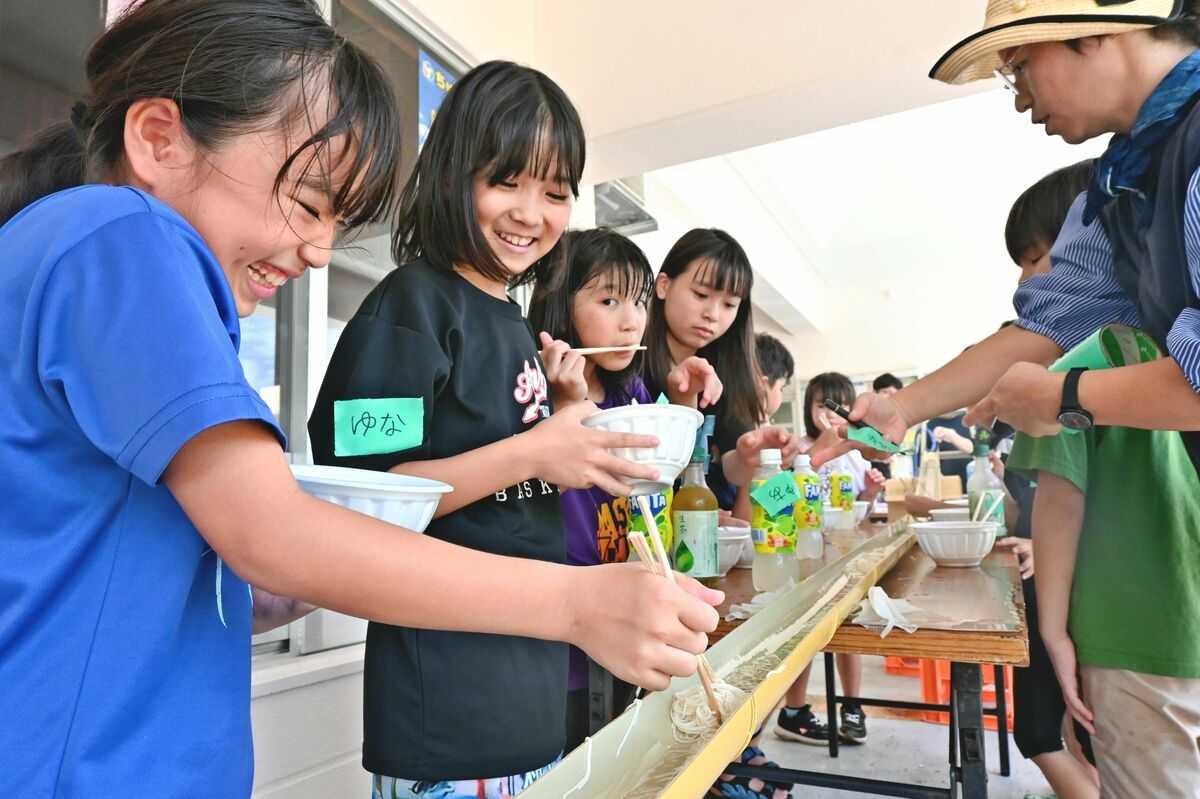 流しそうめんで涼しいひととき 名護の山入端公民館