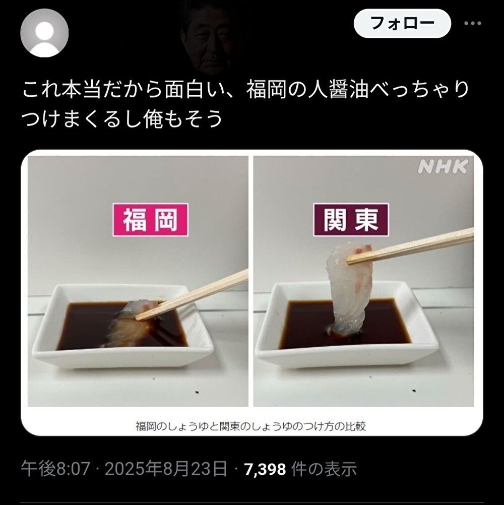 福岡の人は醤油皿に醤油を注ぐんじゃなくて、直接刺身に醤油をかけちゃう人もいるらしいな。