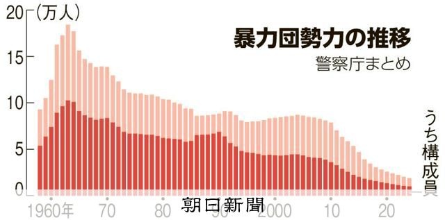 暴力団勢力初めて2万人割る 「匿流」1万人摘発、暴力団と連携も:朝日新聞昨年末時点の暴力団勢力は1万8800人で、20年続けて減少し、警察庁が統計を取り始めた1958年以降、初めて2万人を下回った。一方で、メンバーらがSNSで緩くつながり、多様な犯罪で資金を得る「匿名・…www.asahi.com
