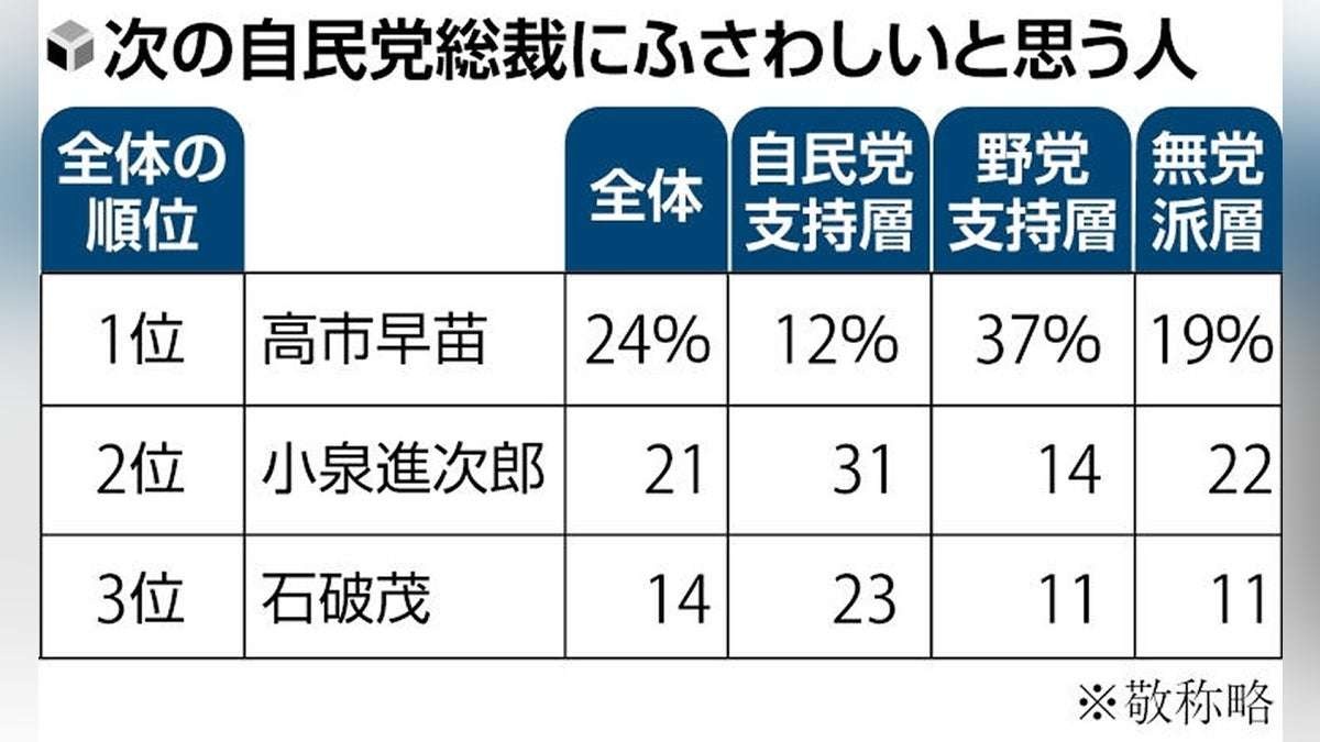 読売新聞社が22~24日に行った全国世論調査で、次の自民党総裁にふさわしい政治家を聞いたところ、1位は高市早苗・前経済安全保障相の24%、2位は小泉農相の21%、3位は石破首相の14%だった。自民党の政治家10人から選んでもらった。「いない」は14%。