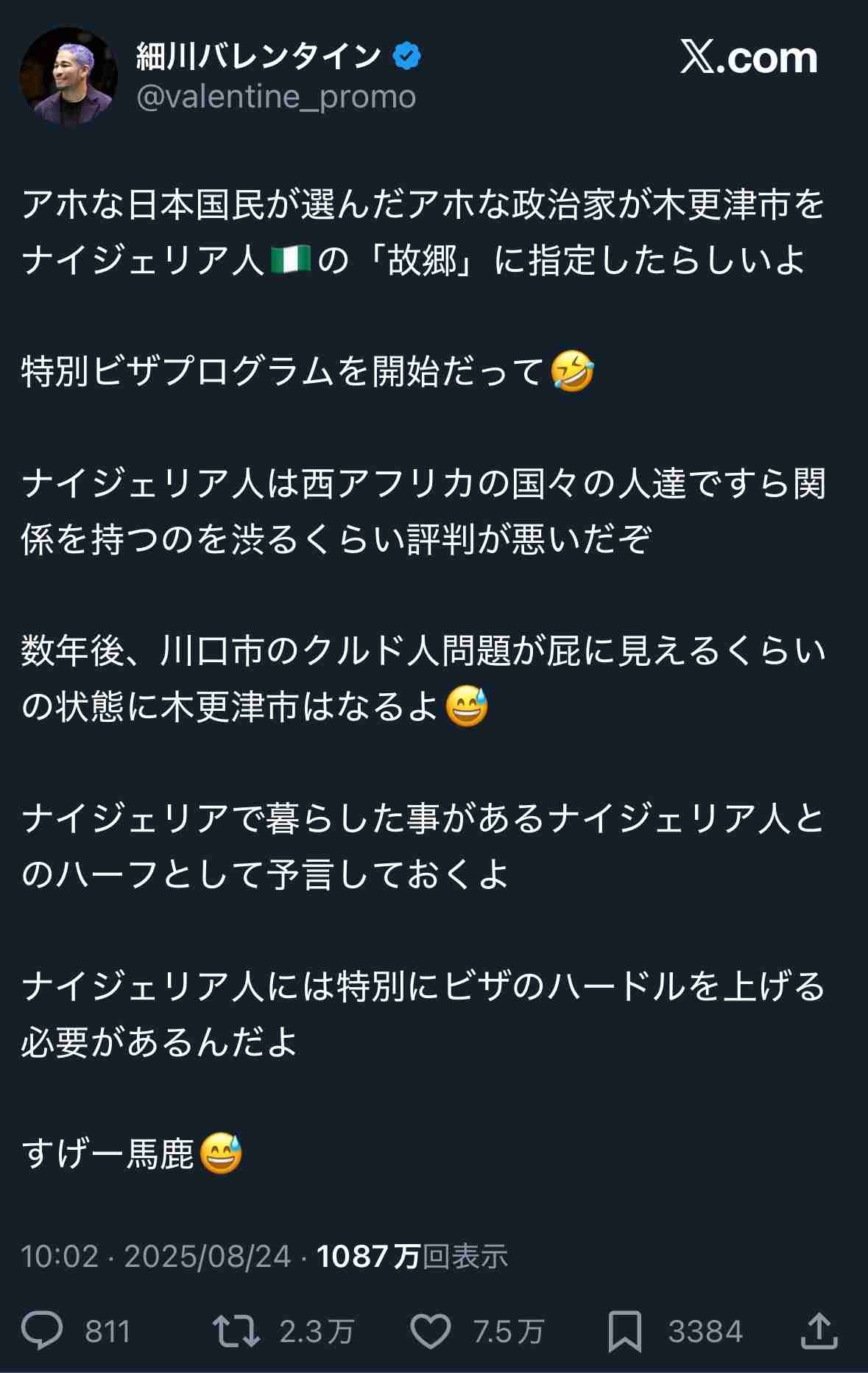 アホな日本国民が選んだアホな政治家が木更津市をナイジェリア人🇳🇬の「故郷」に指定したらしいよ特別ビザプログラムを開始だって🤣