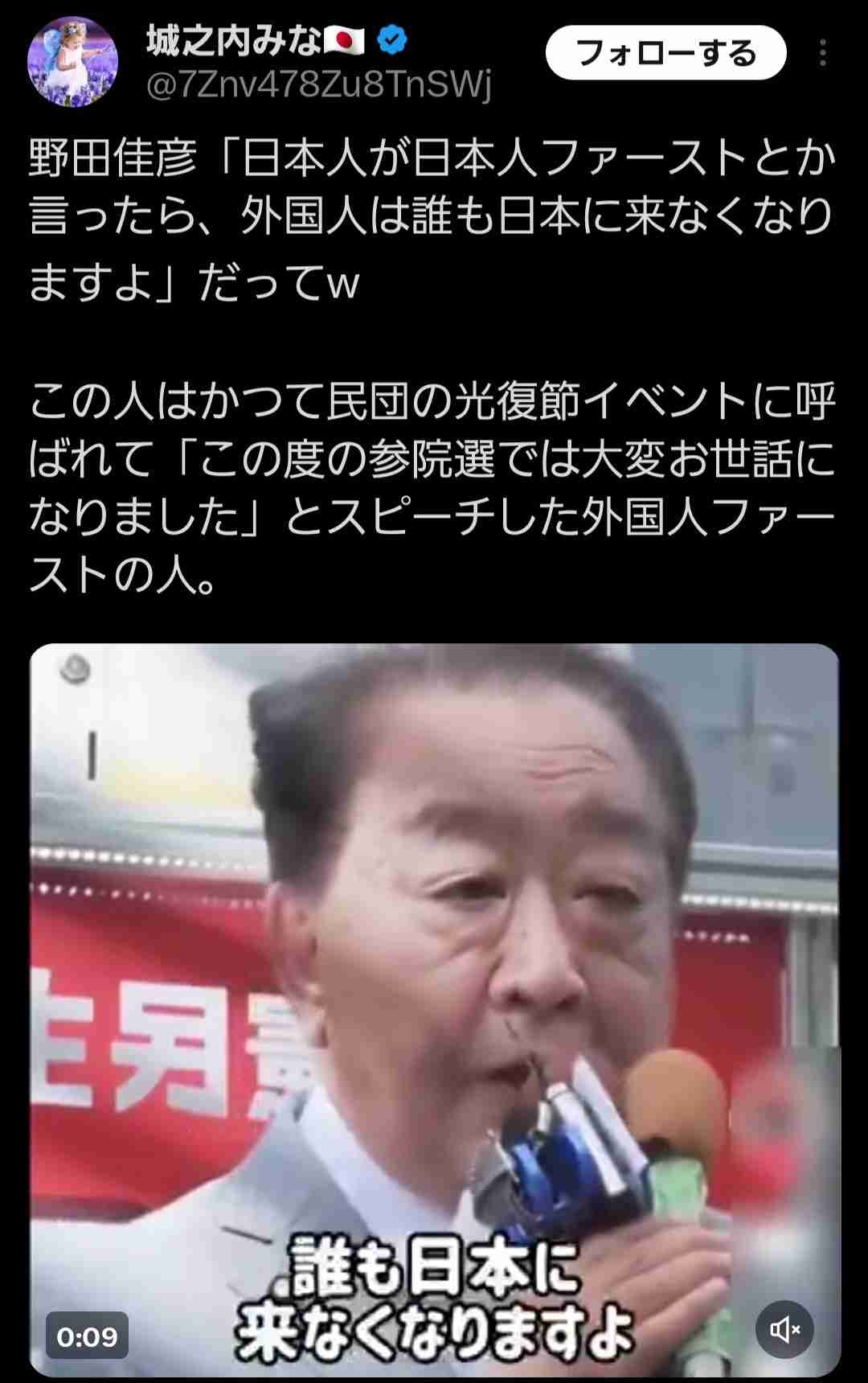 野田佳彦「日本人が日本人ファーストとか言ったら、外国人は誰も日本に来なくなりますよ」だってw