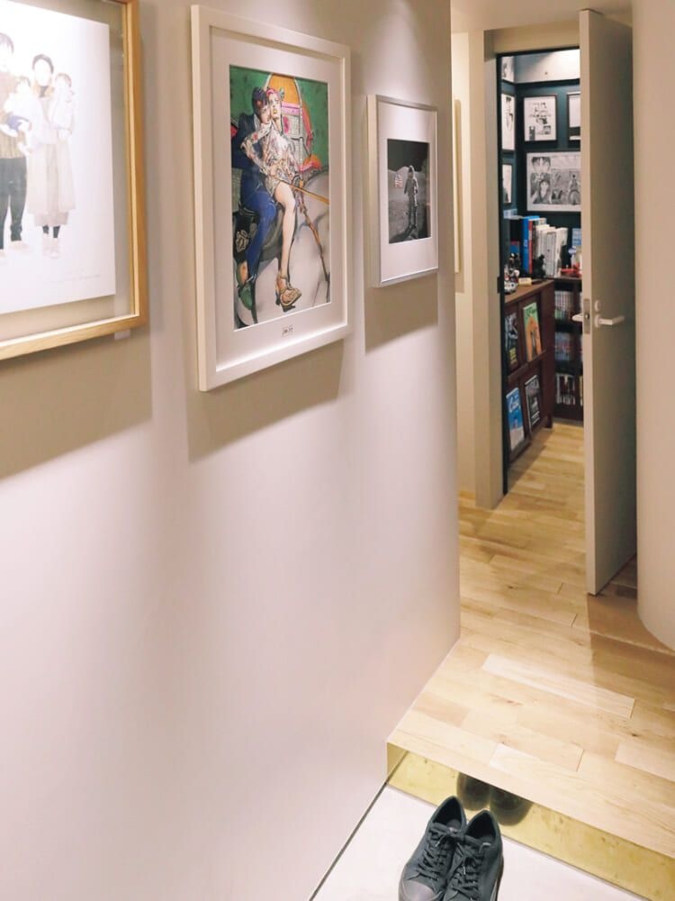 ママ廊下の白壁に飾られるのは、ママの趣味の家族写真。そしてパパ廊下は圧巻だ。