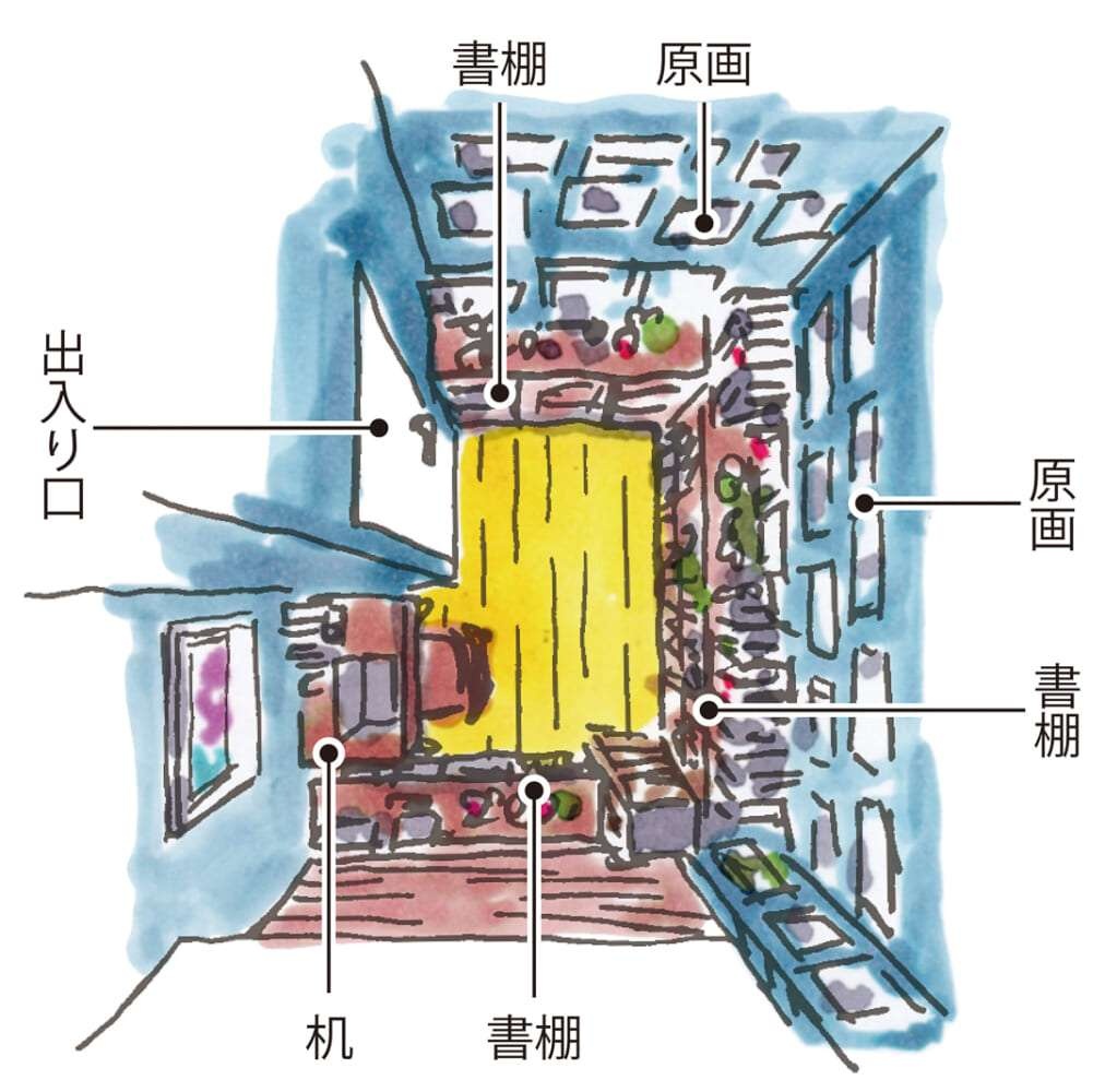 今回の秘密基地はこの「パパ廊下」を入ってすぐの場所。面積にして一坪ほどの空間は、昭和から平成、令和に至るまでの長編漫画単行本、そして名場面原画にフィギュアの類で埋め尽くされている。