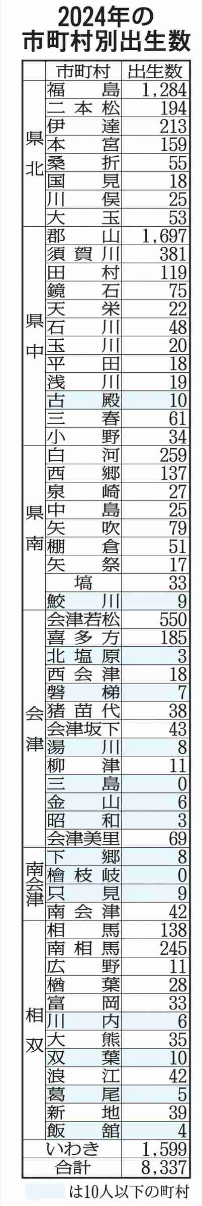 出生10人以下15町村 2024年福島県内三島と檜枝岐ゼロ