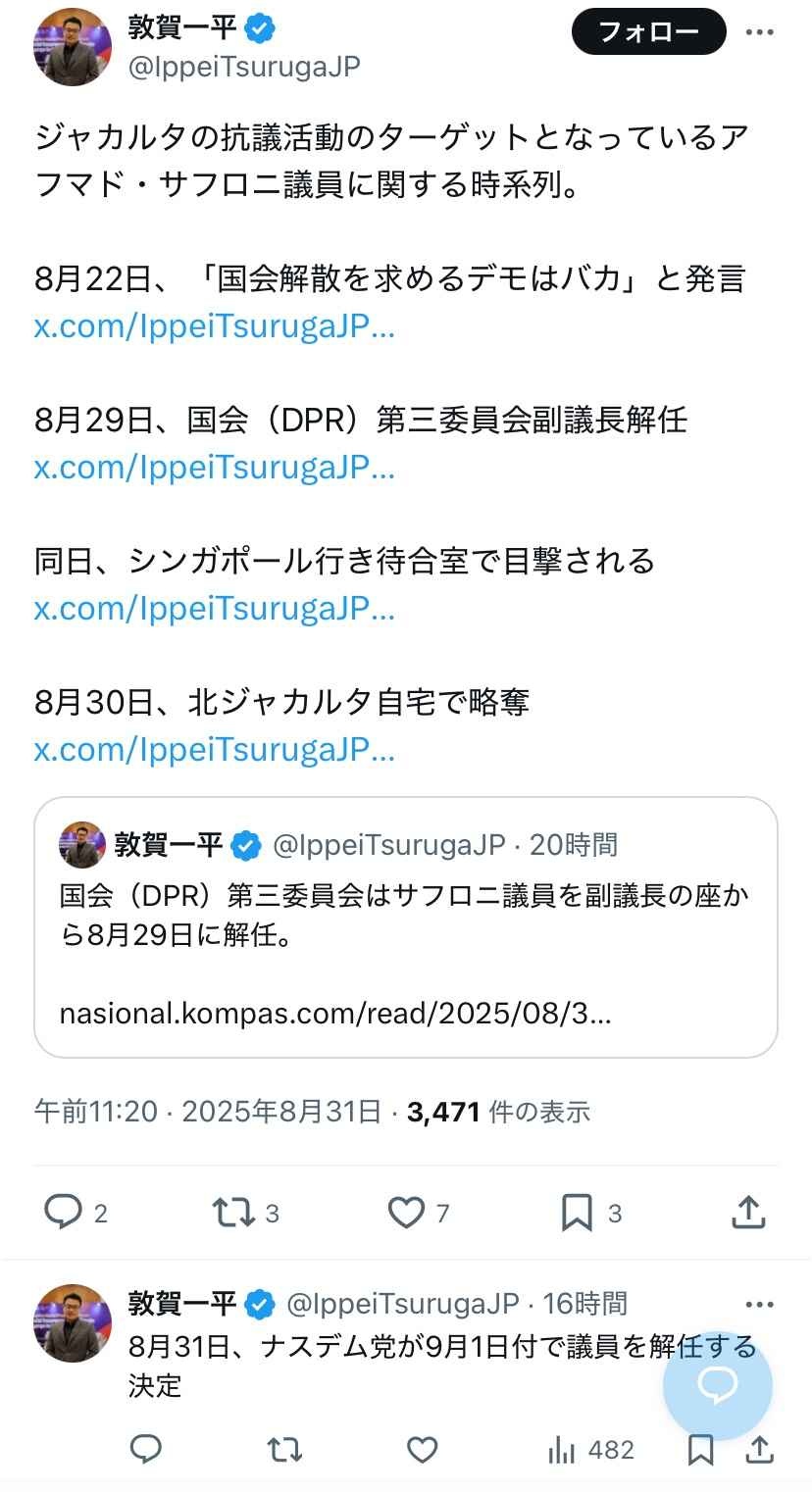 「デモするやつはバカ」と言ったインドネシア議員、怒り狂った国民に自宅を襲撃されシンガポールに逃亡したあとに国会議員クビ