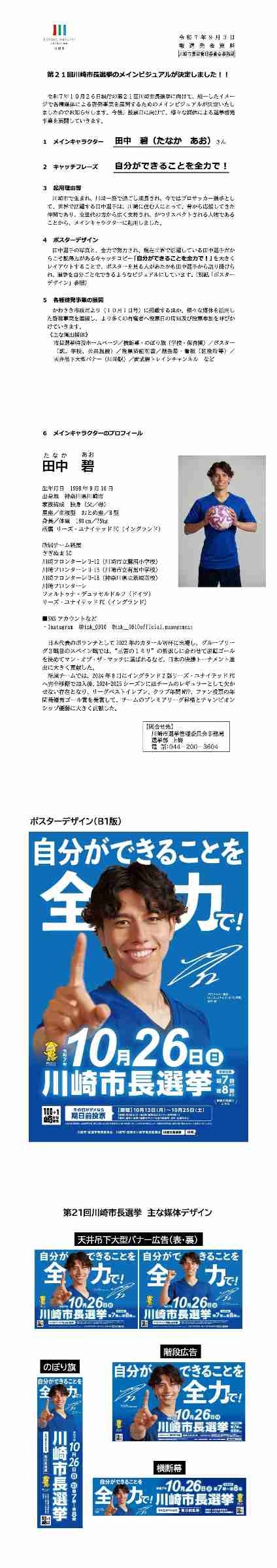 田中碧が川崎市長選挙のメインビジュアルに起用されたとのことでリリースが出ています。川崎市長選は、10月26日に投開票されます。 起用理由
