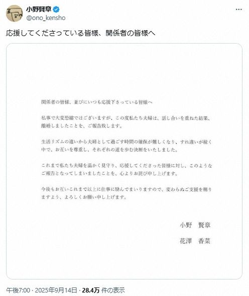 声優の小野賢章(35)が14日、自身のXで離婚を発表した。妻は声優の花澤香菜(36)。