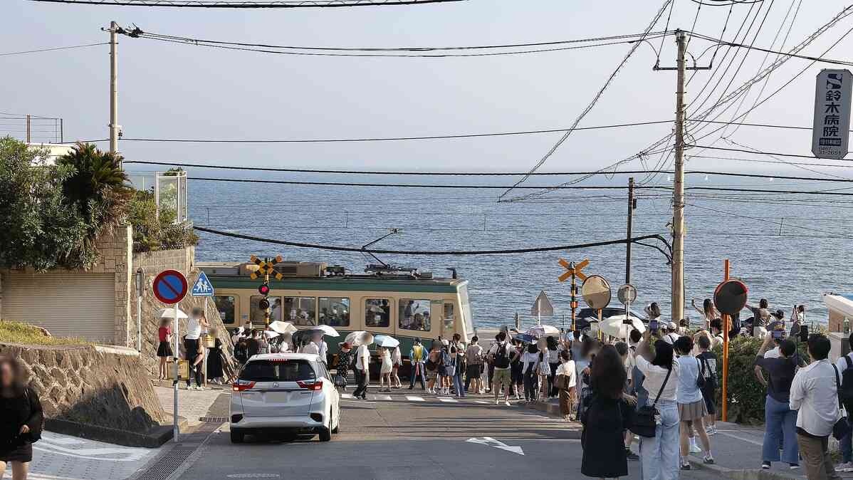 「スラムダンク」の聖地とされる江ノ島電鉄「鎌倉高校前」駅の踏切。外国人観光客が急増し、「観光公害」に脅かされているとFRIDAYが報じた。私有地に不法侵入し、用を足す悪質な観光客が増えるなどしているとのこと
