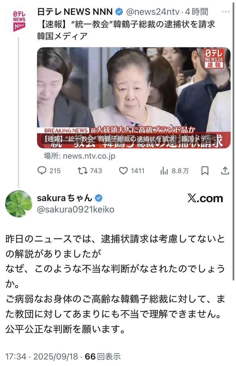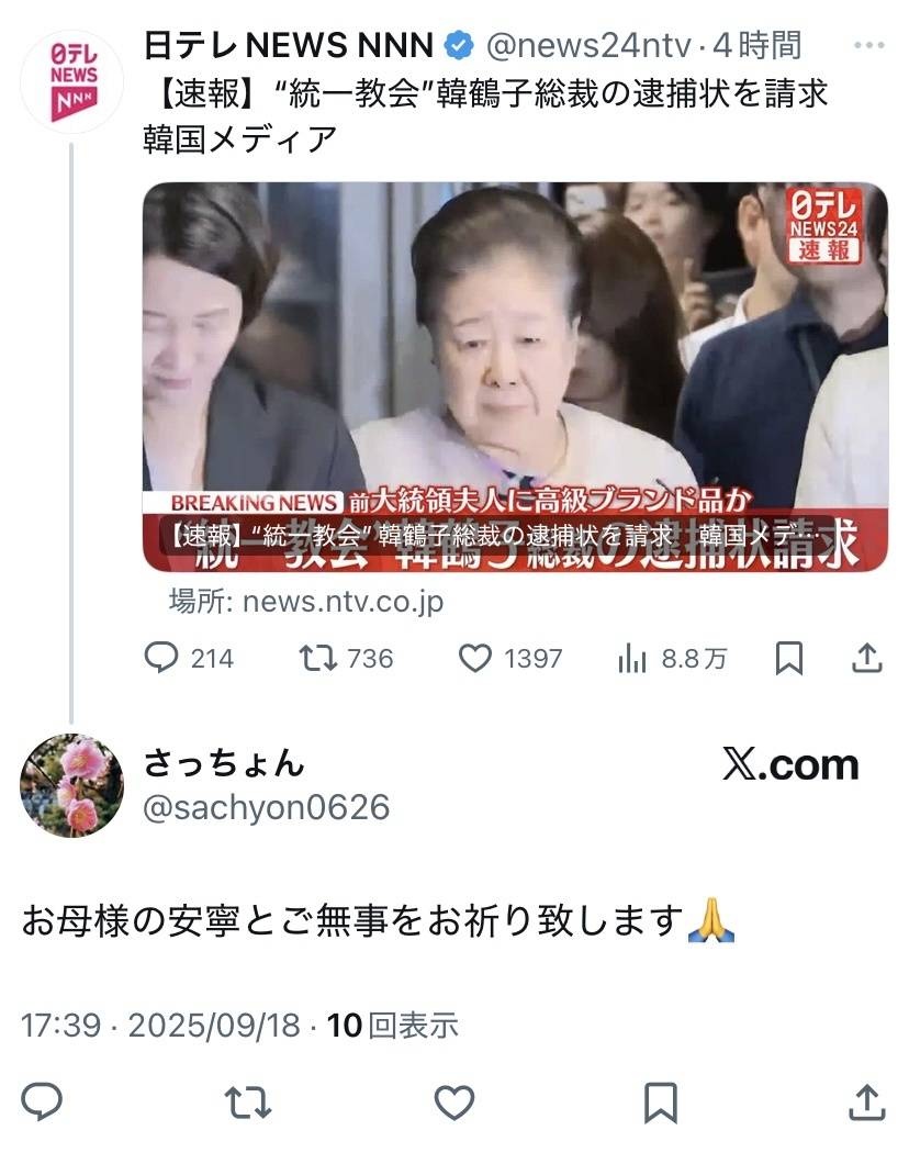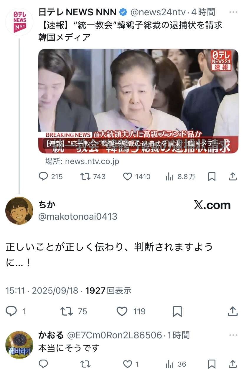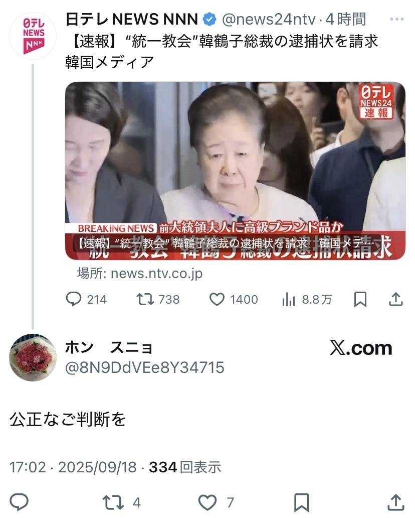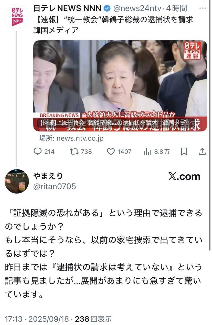 【速報】“統一教会”韓鶴子総裁の逮捕状を請求 韓国メディア(2025年9月18日掲載)|日テレNEWS NNN韓国の尹錫悦前大統領の妻・金建希氏をめぐる疑惑を捜査する特別検察官が、世界平和統一家庭連合いわゆる“統一教会”の韓鶴子総裁の逮捕状を請求したと韓国メディアが伝えました。news.ntv.co.jp