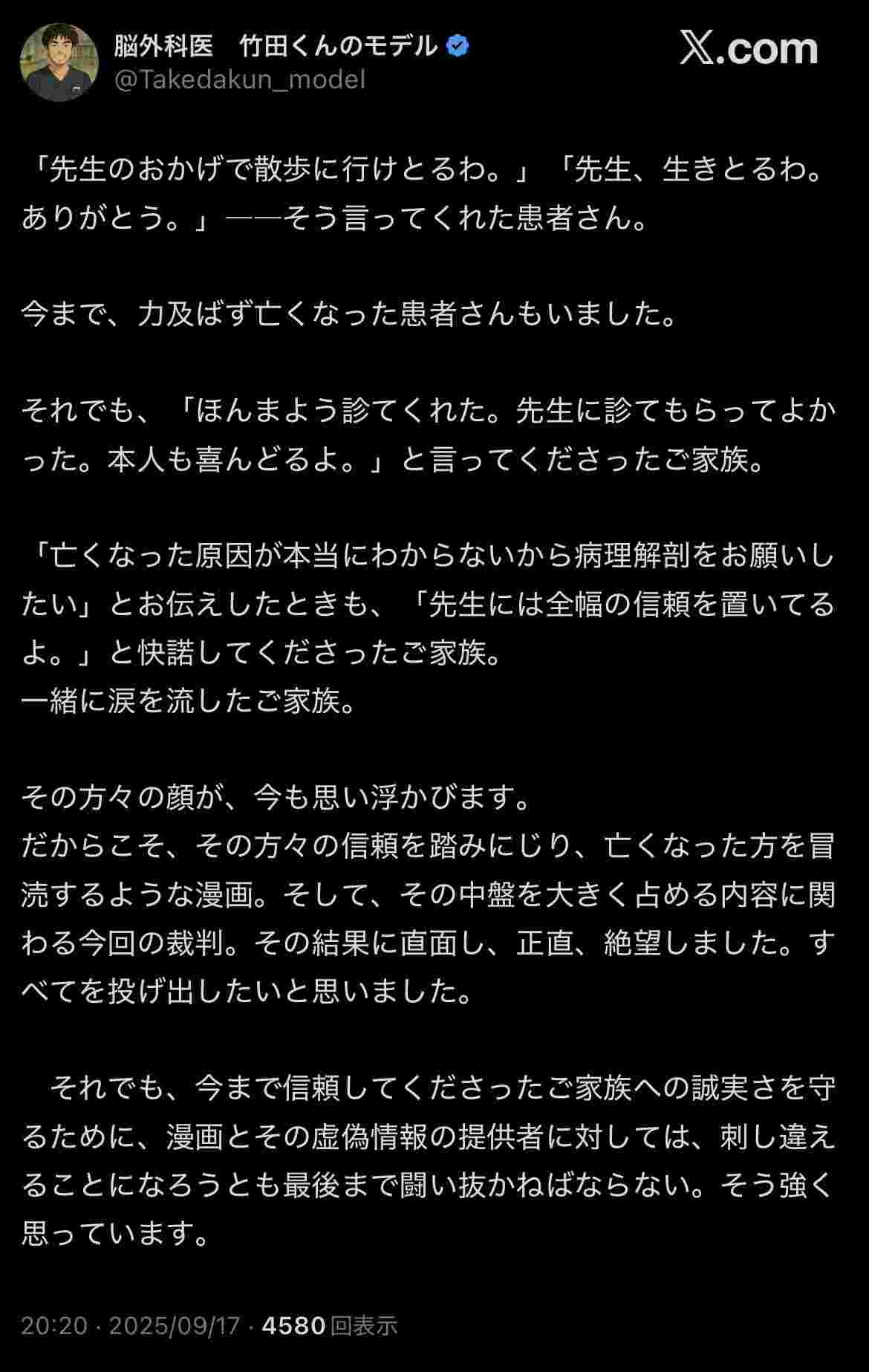 脳外科医 竹田くんのモデル「裁判の結果に絶望しましたー