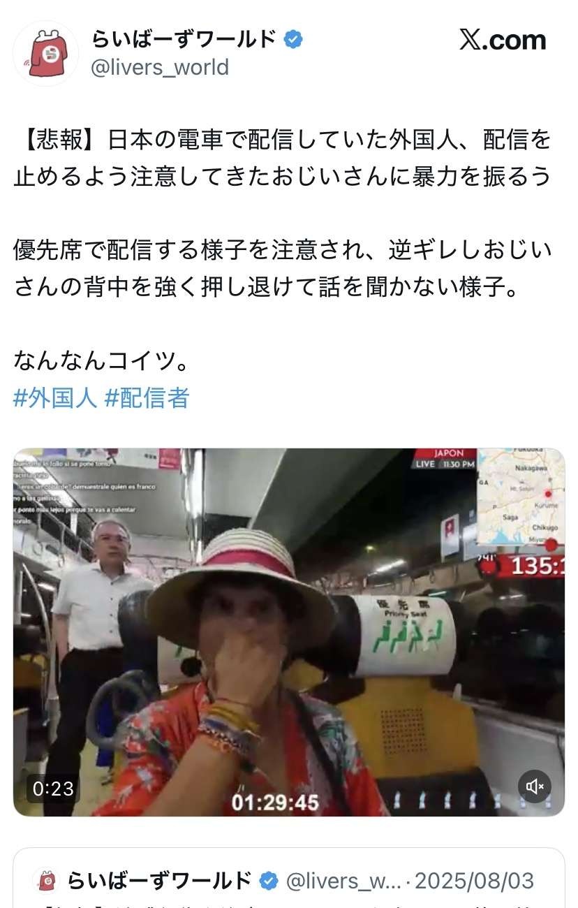 【悲報】日本の電車で配信していた外国人、配信を止めるよう注意してきたおじいさんに暴力を振るう