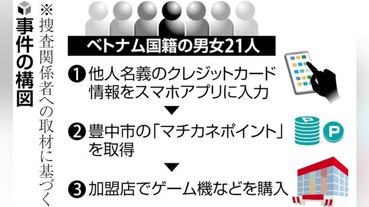 他人名義のクレジットカード情報などを使って不正に取得した「デジタル地域通貨」でゲーム機などを購入したとして、大阪府警がベトナム国籍の指示役の男(33)ら21人を組織犯罪処罰法違反(犯罪収益隠匿)などの容疑で逮捕、送検していたことが捜査関係者への取材でわかった。自治体によるデジタル地域通貨の導入が進む中、府警はセキュリティー対策の弱さを狙われた可能性があるとみている。
