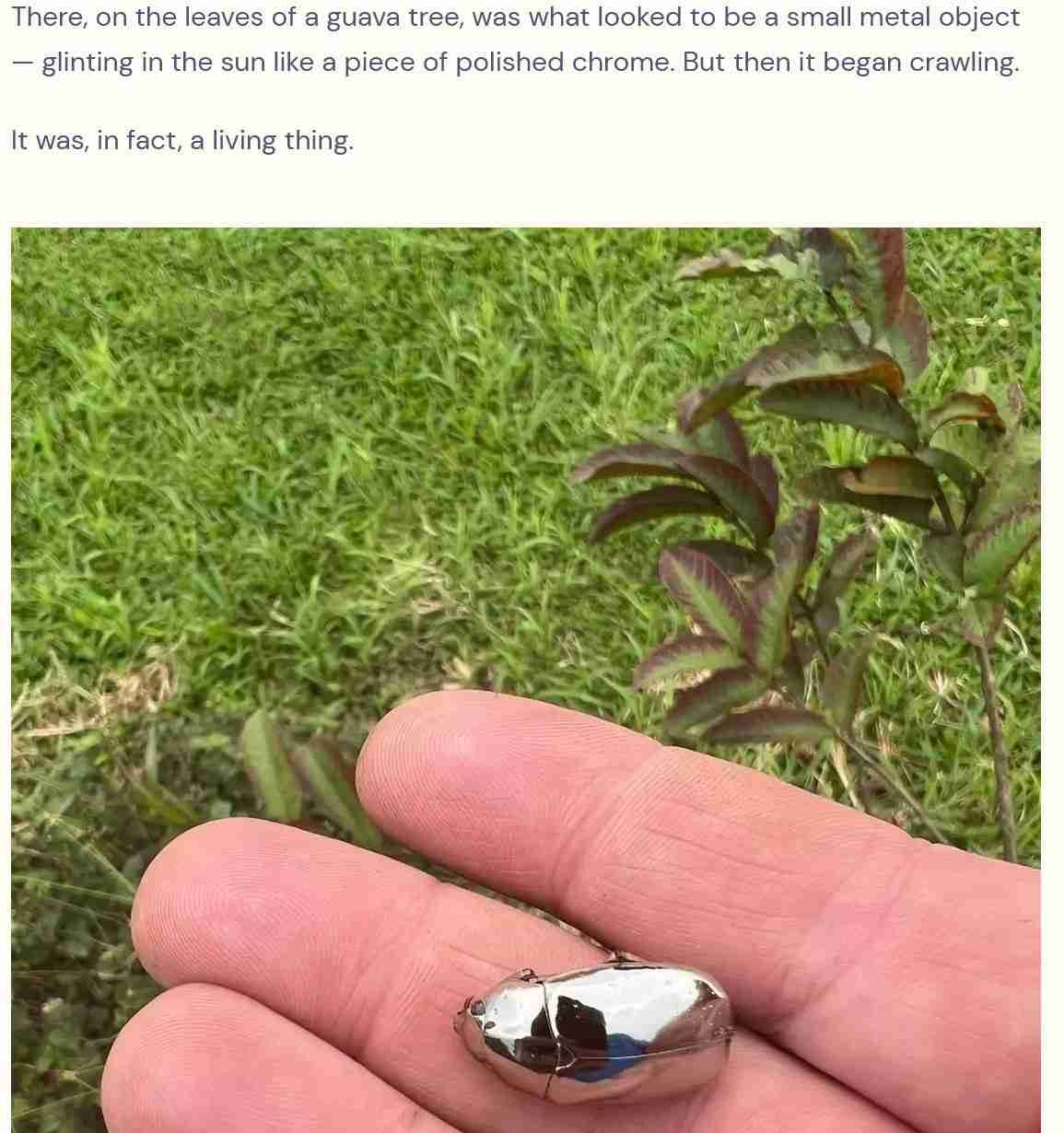 そこには、グアバの木の葉の上に小さな金属のような物体があり、