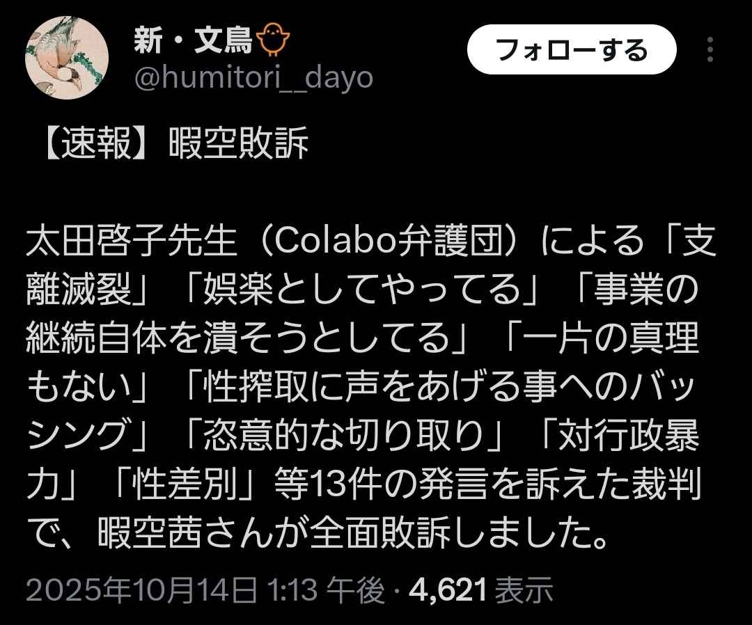 【定期】暇空茜、また敗訴🥸太田弁護士の「支離滅裂」「娯楽としてやってる」等の発言を訴え全面敗訴