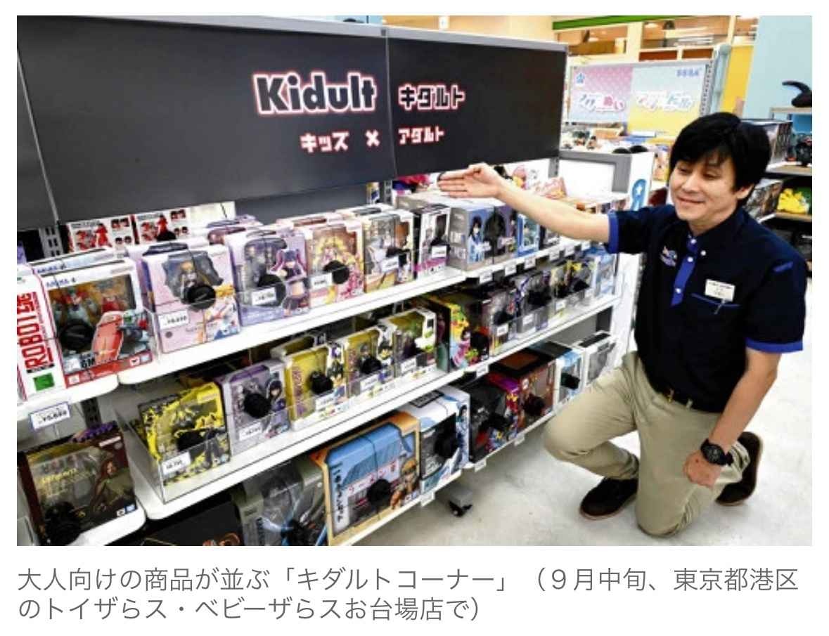 「キダルト」は「子ども(kids)の心を持った大人(adult)」を意味する造語。日本トイザらス社では全国37店舗でキダルトコーナーを展開し、今春にはキダルト向け商品に特化した専門店も2店舗オープンさせた。