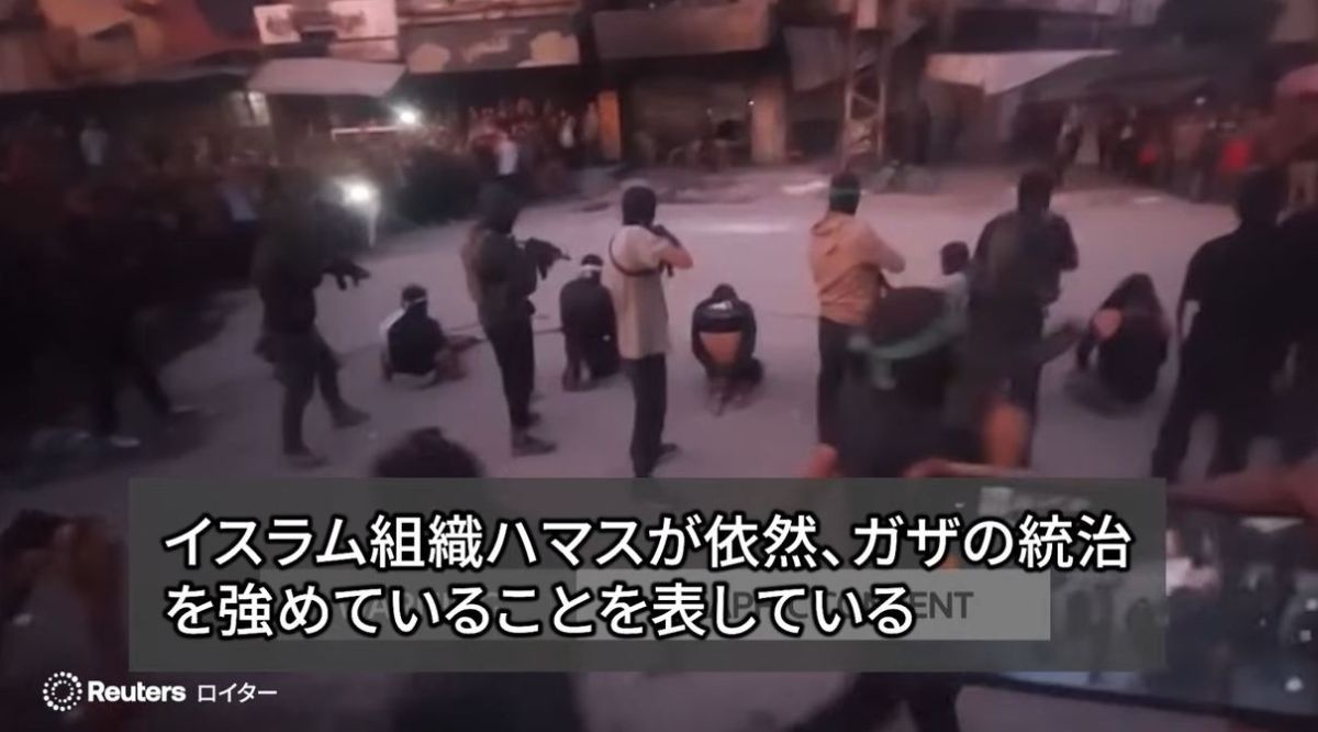 映像では、イスラエルに協力したとされる7人の男性が膝をつかされ、背後から撃たれる様子が映っている。 市街地で公開処刑、停戦で再びガザ統治を強めるハマス 和平に障害も(ロイター) - Yahoo!ニュースパレスチナ自治区ガザでの停戦が発効したことで、イスラム組織ハマスが急速に息を吹き返している。13日、ハマス戦闘員が市街地で7人の男性の公開処刑を行う映像がSNS上に拡散した。 これは13日、SNSnews.yahoo.co.jp