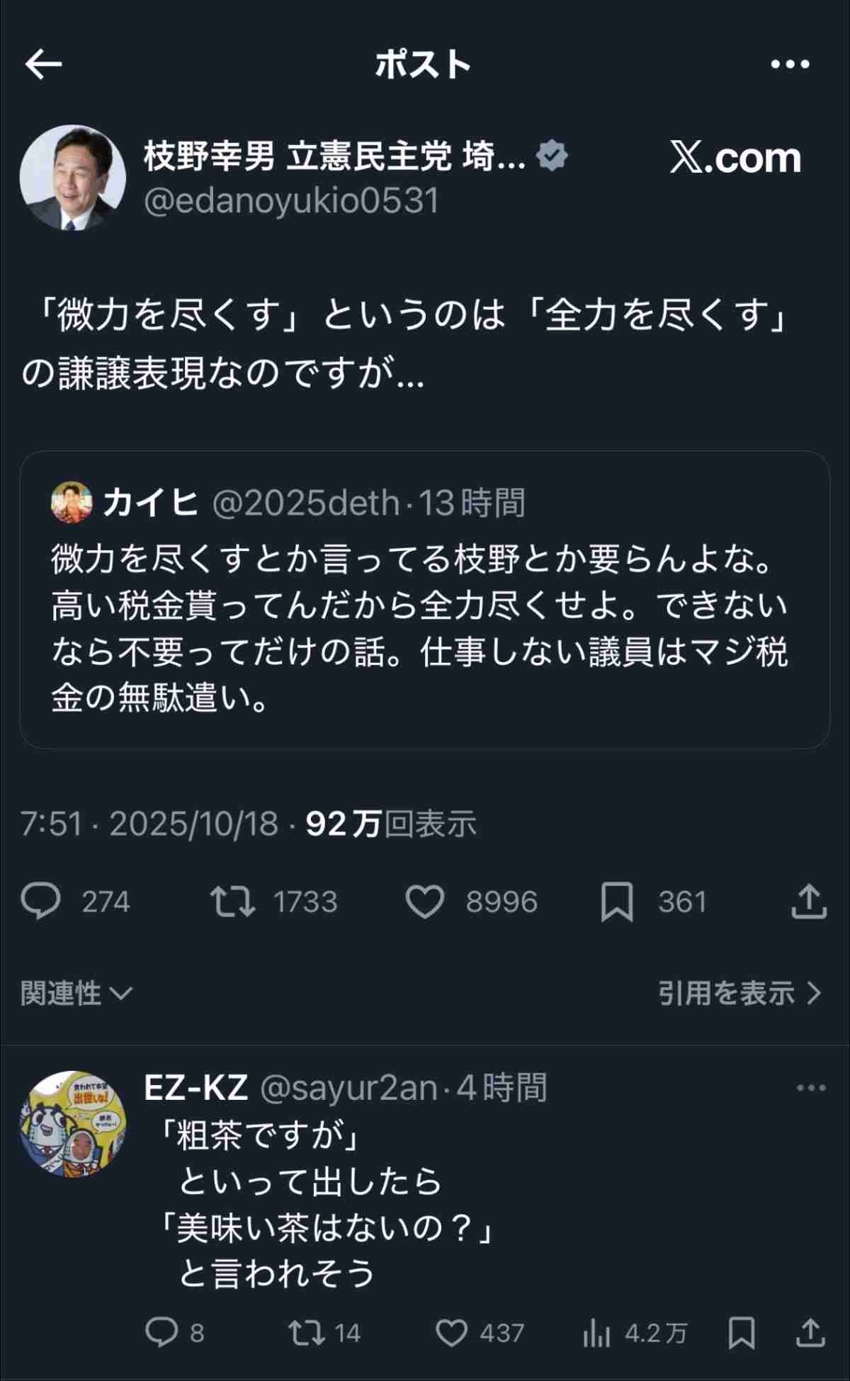 枝野「微力を尽くします」ネトウヨ「全力を尽くせよ💢」枝野「えっと、謙譲表現なんですが…」